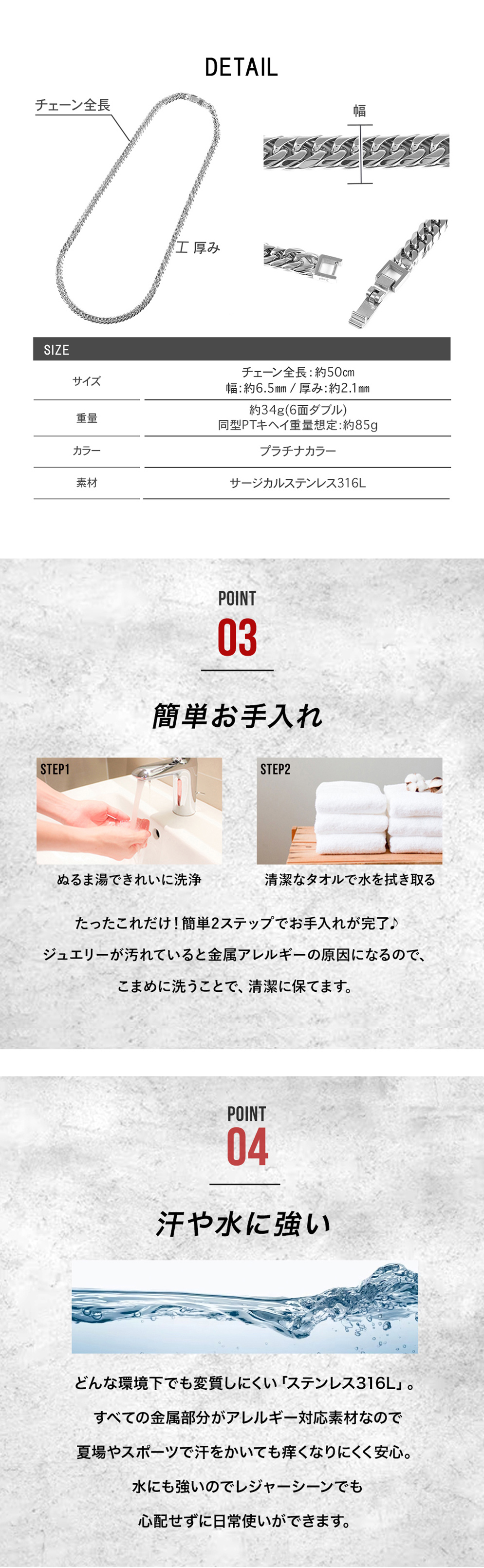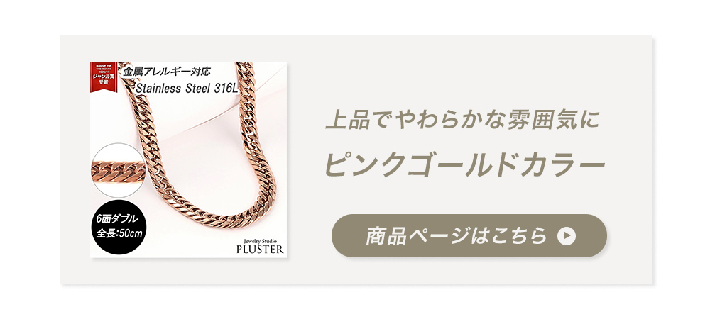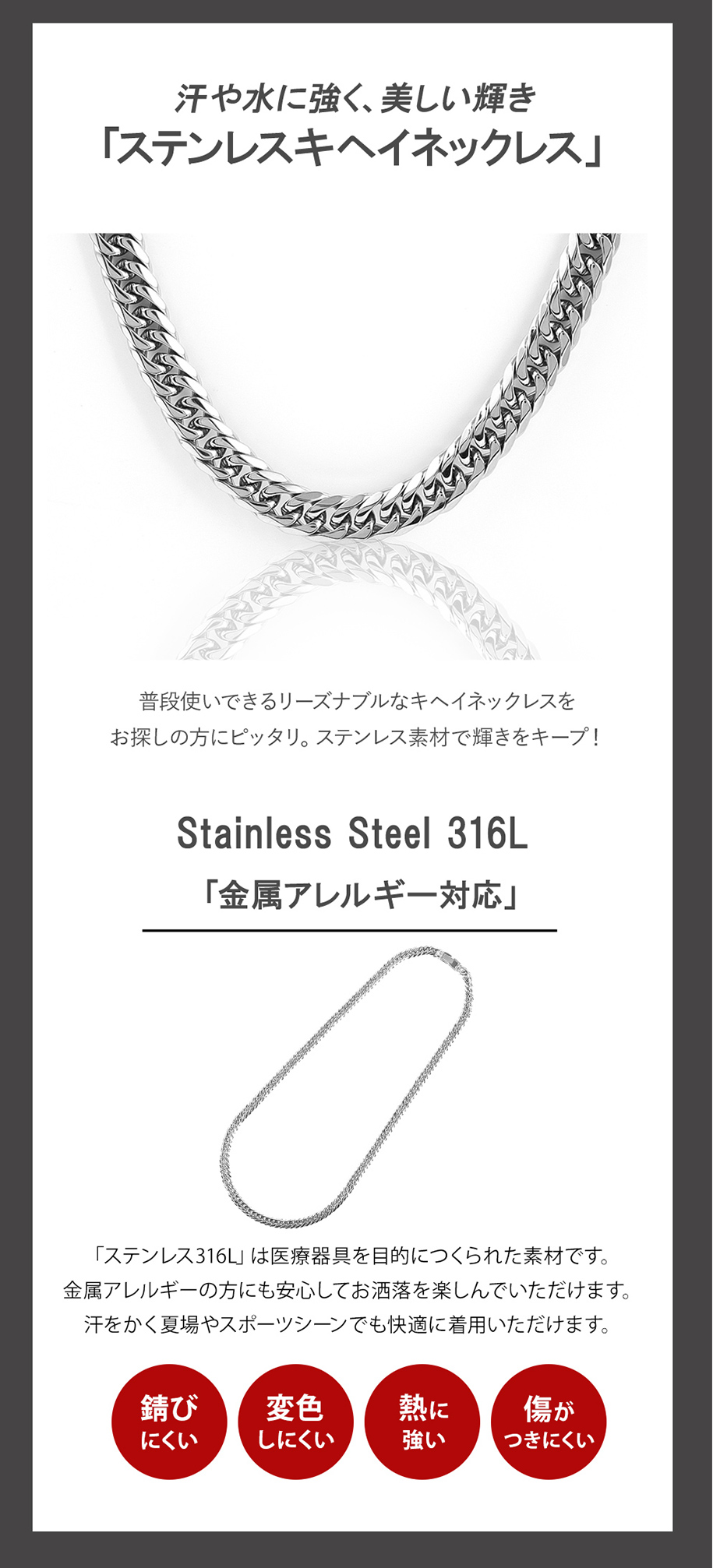 「ステンレス316L」は「 医療用 」のステンレスで、”錆びにくく変色も少ない”という特徴があります。そのため、汗などに接触しても金属が溶け出しにくく、アレルギー反応を起こしにくいので、近年金属アレルギー対応のジュエリー素材として使用されています。アレルギーの方でも安心・安全にオシャレを楽しんでいただきたいからこそ、素材にこだわりました。
