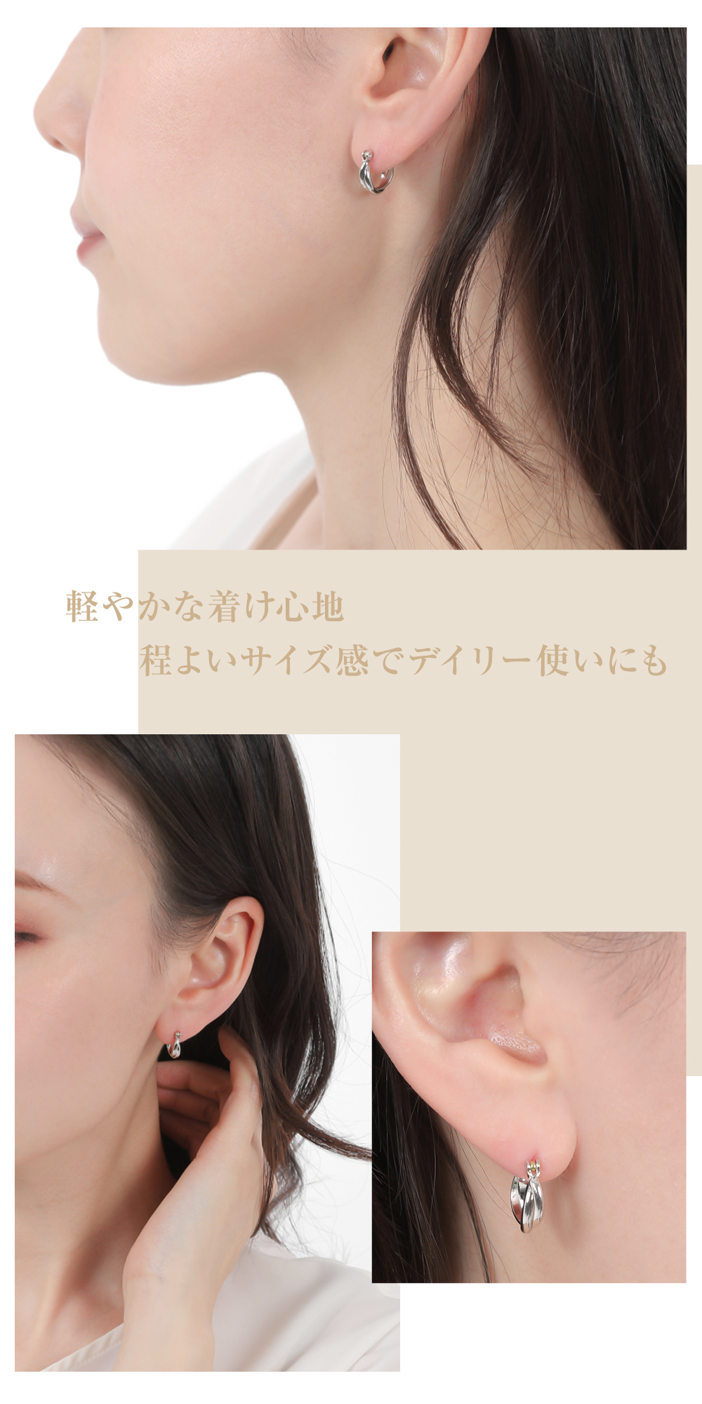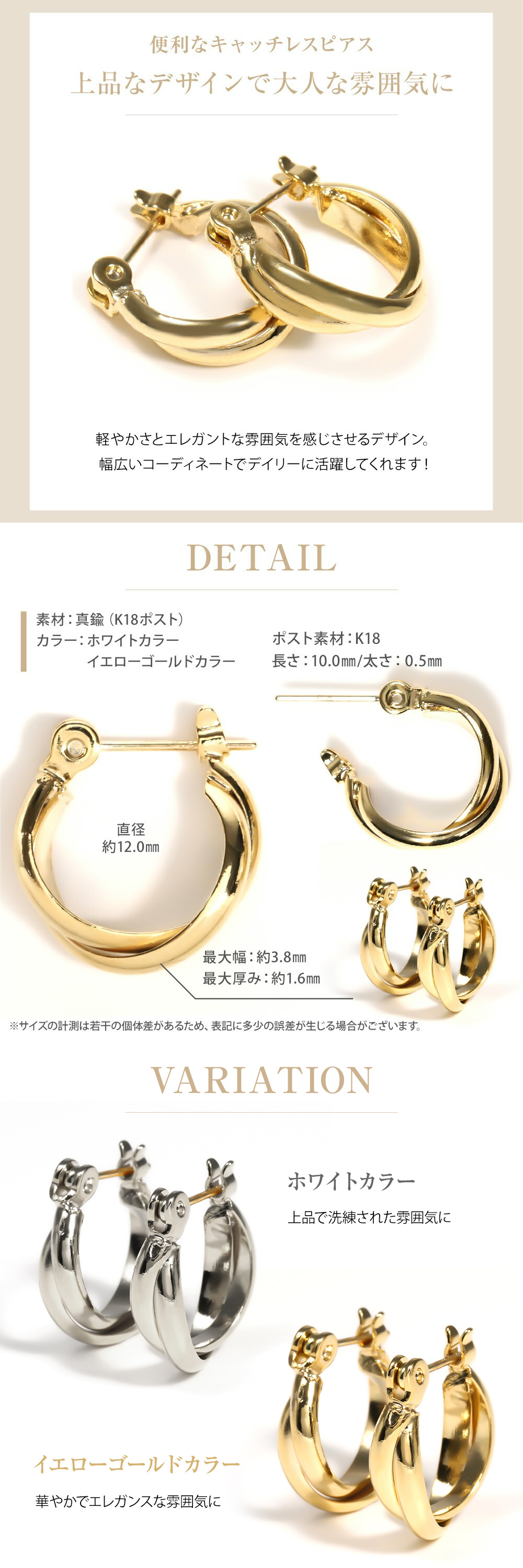「 ホワイトカラー 」と「 イエローゴールドカラー 」の2カラーから選べる フープピアス 。程よい艶感のある キャッチレスピアス は、デイリー使いにもおすすめです。シンプルなデザインで、どんなスタイルにも◎ポスト部分は、金属アレルギー対応の「 K18 ( 18金素材 ) 」を使用してるので、お肌に優しく安心です。