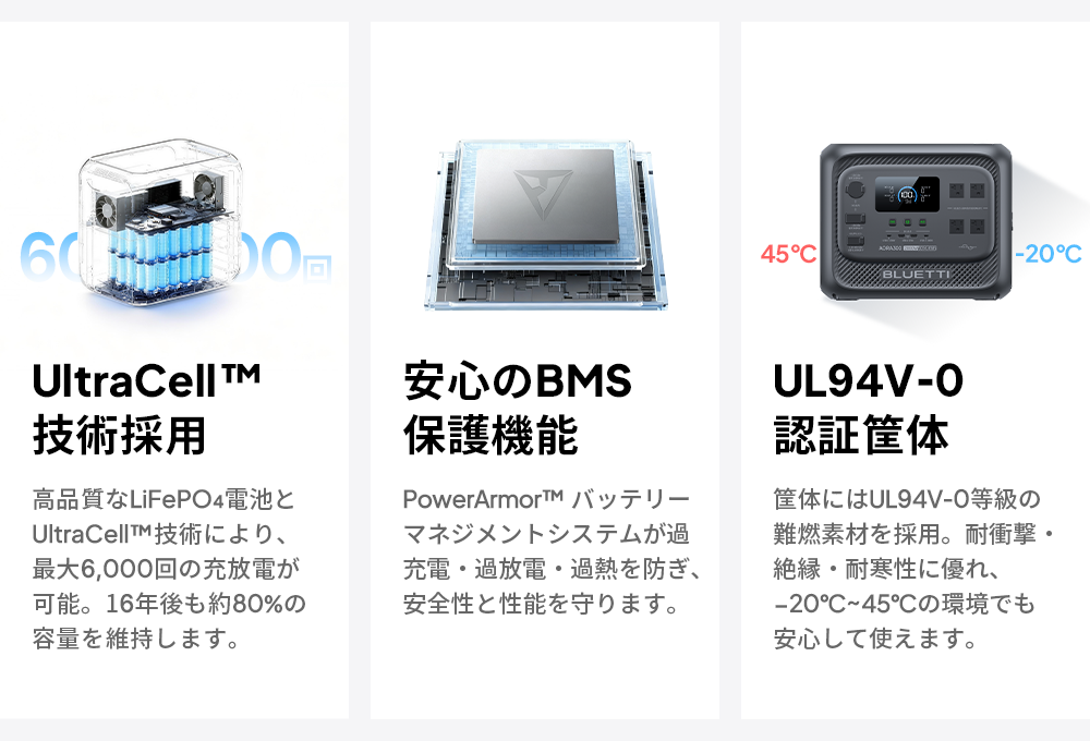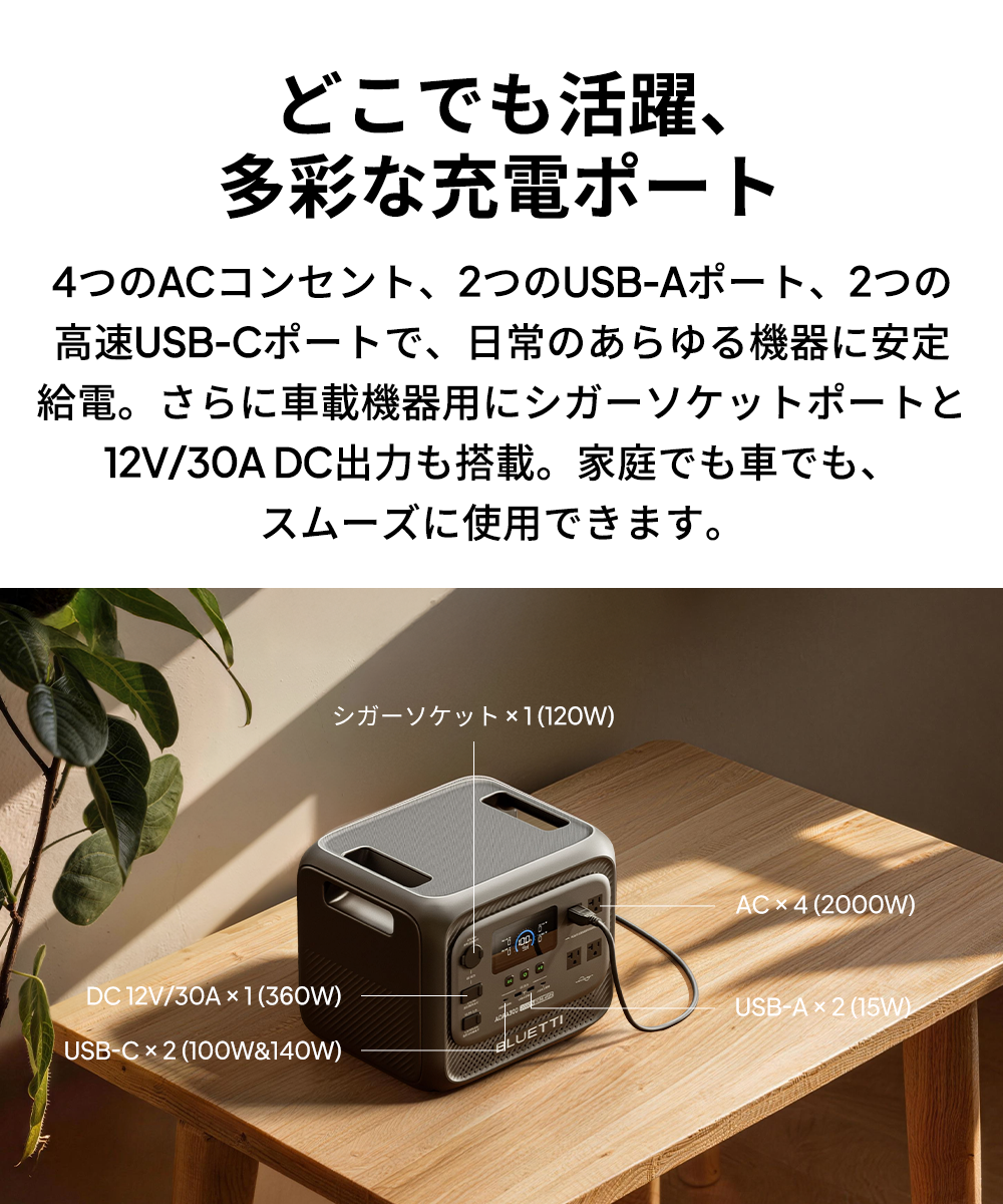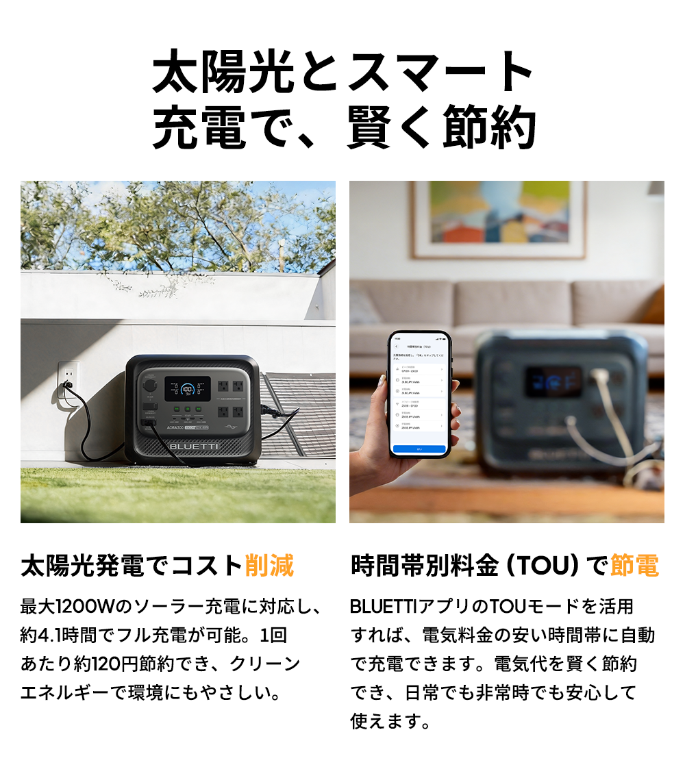 【どこでも活躍、多彩な充電ポート】 2つのACコンセント、2つのUSB-Aポート、2つの高速USB-Cポートで、日常のあらゆる機器に安定給電。さらに車載機器用にシガーソケットポートと12V/30A DC出力も搭載。家庭でも車でも、スムーズに使用できます。 【走行充電でアウトドア電力確保】 カー充電モード (560W) 対応。ドライブやキャンプ中でも車から充電可能。キャンピングカーや車載冷蔵庫などの継続稼働をサポートします。 【4つの充電方法で、効率的に給電】 AC・ソーラー・走行・ハイブリッドの4つの充電方式に対応。急ぎの使用時や走行中、アウトドアでも、あらゆるシーンで効率的に充電・安定給電が可能です。 【家族の電力消費を1台で】 Apex300スマート電源システムは、家庭防災からアウトドア探検まで。スマート対応アクセサリーと組み合わせることで、家庭用予備電源、キャンピングカー、オフグリッド生活など、あらゆる電力ニーズに対応。いつでもどこでも、安定・安全な高品質な電力をお楽しみいただけます。 【0.01秒の瞬時切替で、電力を途切れさせない】 10ミリ秒未満の高速UPS切替により、停電時も瞬時に給電を継続。冷蔵庫や照明、精密機器などを安全に安定稼働させます。 【非常時も安心の家庭用蓄電池 停電時に必要な照明や家電をしっかりサポート。コンパクト設計で置き場所を選ばず、非常時も家族と快適に安心して過ごせます。 【安心の5年保証】 Aora300は5年保証付きで、長く安心してご利用いただけます。環境面では、コバルトフリーの高い安全性のあるリン酸鉄リチウムバッテリー(LiFePO4)を採用し、1日1回使用でも15年以上の寿命があり、廃棄物削減に貢献します。 BLUE LIFE環境理念に基づき、日本国内ではBLUETTI製品の無料回収プログラムを実施し、分解された部品の95%以上を再資源化。お客様の製品ニーズに応えるだけでなく、地球環境保護にも積極的に貢献します。 ※Yahoo!ショッピングにおけるBLUETTI製品の正規直販サイトは、BLUETTI(https://shopping.geocities.jp/poweroak/)のみです。他のショップ及び転売者様よりご購入された場合は、BLUETTI保証サービスの適用は除外されますので、予めご了承願います。 ※製品の改良・改善等のため、予告なく製品仕様が変更される場合がありますので、予めご了承願います。 |