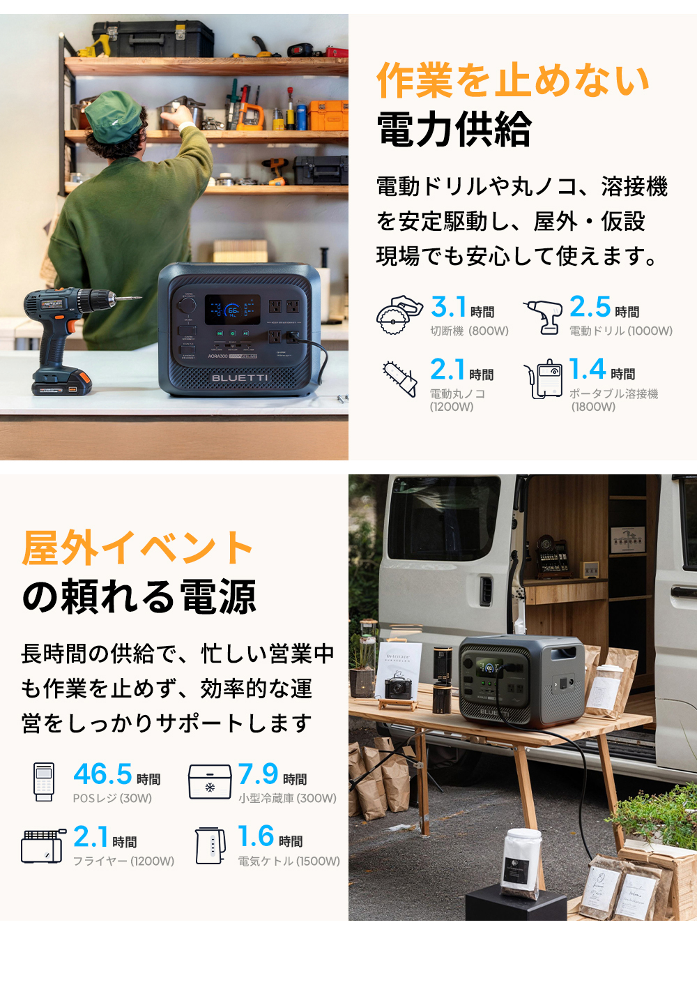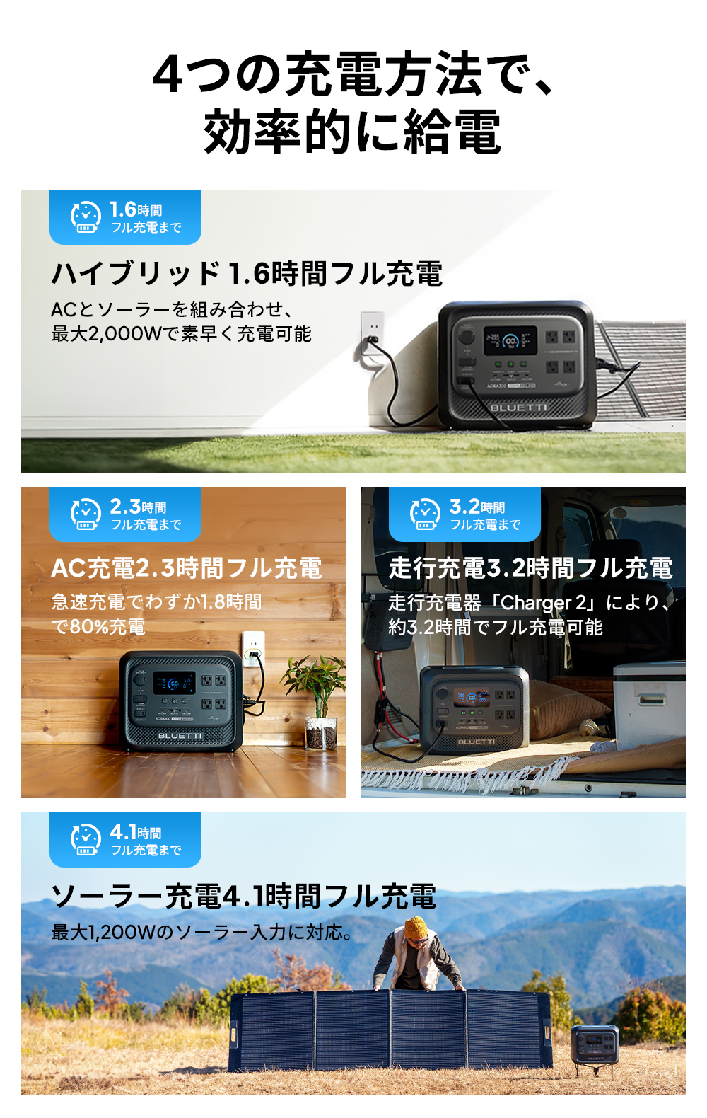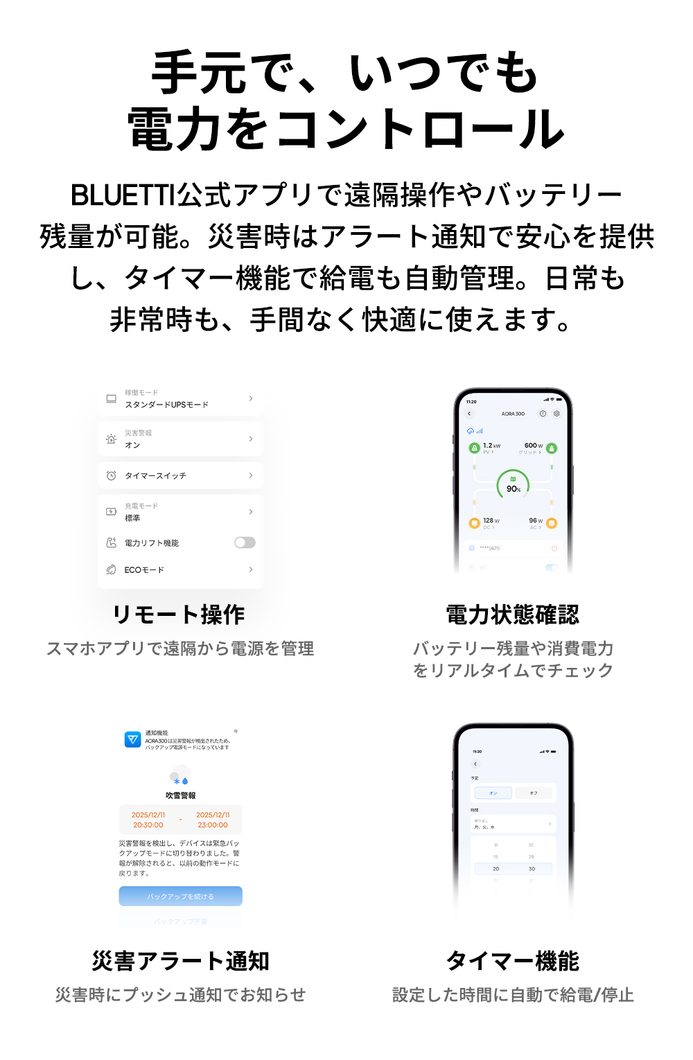 【どこでも活躍、多彩な充電ポート】 2つのACコンセント、2つのUSB-Aポート、2つの高速USB-Cポートで、日常のあらゆる機器に安定給電。さらに車載機器用にシガーソケットポートと12V/30A DC出力も搭載。家庭でも車でも、スムーズに使用できます。 【走行充電でアウトドア電力確保】 カー充電モード (560W) 対応。ドライブやキャンプ中でも車から充電可能。キャンピングカーや車載冷蔵庫などの継続稼働をサポートします。 【4つの充電方法で、効率的に給電】 AC・ソーラー・走行・ハイブリッドの4つの充電方式に対応。急ぎの使用時や走行中、アウトドアでも、あらゆるシーンで効率的に充電・安定給電が可能です。 【家族の電力消費を1台で】 Apex300スマート電源システムは、家庭防災からアウトドア探検まで。スマート対応アクセサリーと組み合わせることで、家庭用予備電源、キャンピングカー、オフグリッド生活など、あらゆる電力ニーズに対応。いつでもどこでも、安定・安全な高品質な電力をお楽しみいただけます。 【0.01秒の瞬時切替で、電力を途切れさせない】 10ミリ秒未満の高速UPS切替により、停電時も瞬時に給電を継続。冷蔵庫や照明、精密機器などを安全に安定稼働させます。 【非常時も安心の家庭用蓄電池 停電時に必要な照明や家電をしっかりサポート。コンパクト設計で置き場所を選ばず、非常時も家族と快適に安心して過ごせます。 【安心の5年保証】 Aora300は5年保証付きで、長く安心してご利用いただけます。環境面では、コバルトフリーの高い安全性のあるリン酸鉄リチウムバッテリー(LiFePO4)を採用し、1日1回使用でも15年以上の寿命があり、廃棄物削減に貢献します。 BLUE LIFE環境理念に基づき、日本国内ではBLUETTI製品の無料回収プログラムを実施し、分解された部品の95%以上を再資源化。お客様の製品ニーズに応えるだけでなく、地球環境保護にも積極的に貢献します。 ※Yahoo!ショッピングにおけるBLUETTI製品の正規直販サイトは、BLUETTI(https://shopping.geocities.jp/poweroak/)のみです。他のショップ及び転売者様よりご購入された場合は、BLUETTI保証サービスの適用は除外されますので、予めご了承願います。 ※製品の改良・改善等のため、予告なく製品仕様が変更される場合がありますので、予めご了承願います。 |