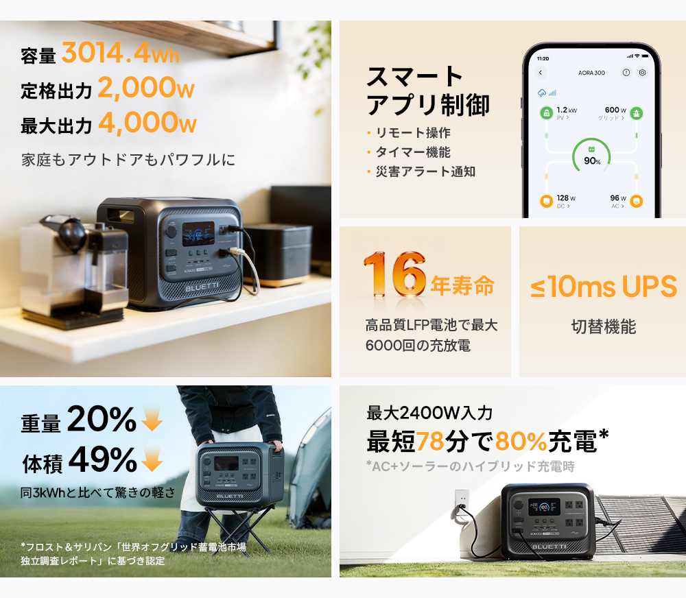 【クーポンで179,450円 4/1~】BLUETTI ポータブル電源 Aora 300 3014.4Wh 大容量 2000W出力 長寿命 UPS 非常用電源 家庭用 アウトドア 節電