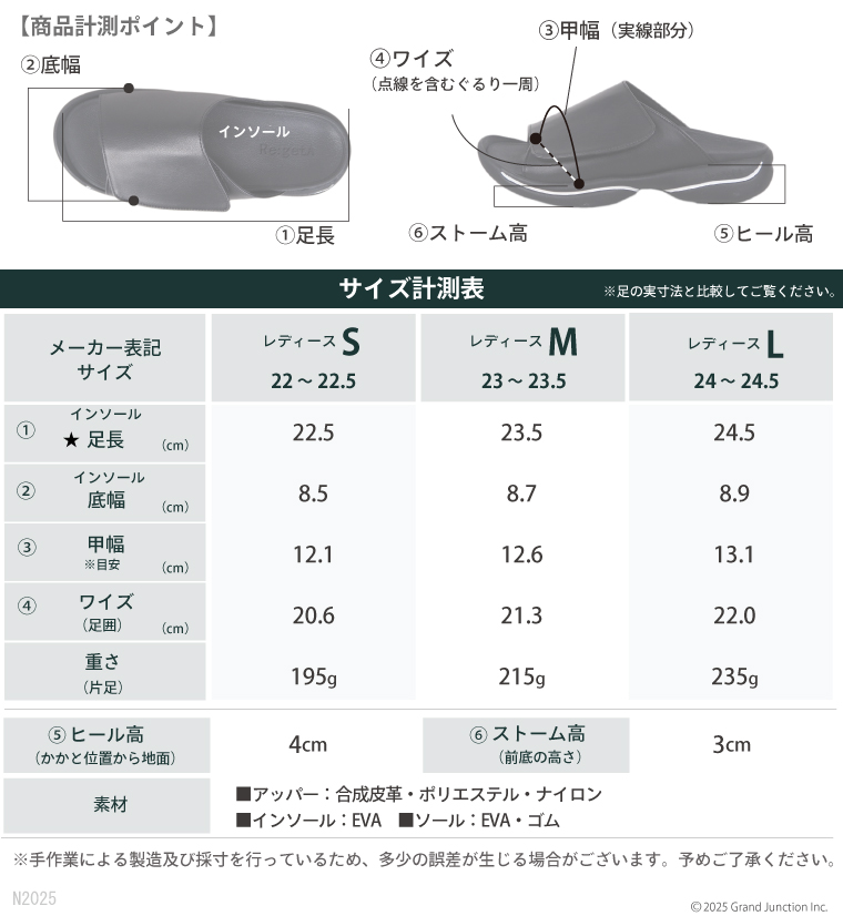| 素材 | アッパー:合成皮革・ポリエステル・ナイロン インソール:EVA アウトソール:EVA・ゴム |