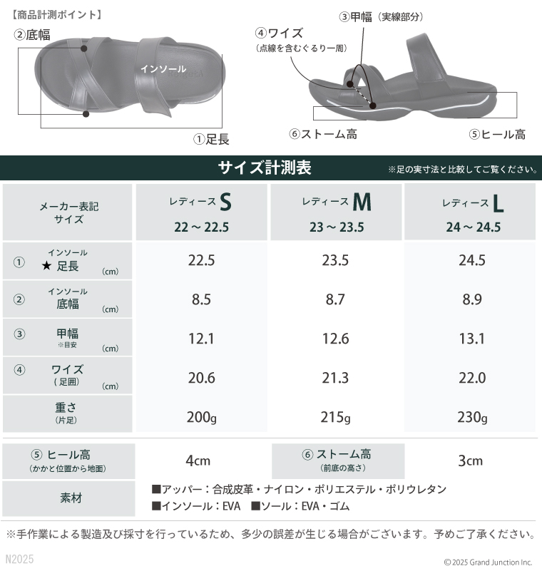 | 素材 | アッパー:合成皮革・ポリエステル・ナイロン・ポリウレタン インソール:EVA アウトソール:EVA・ゴム |