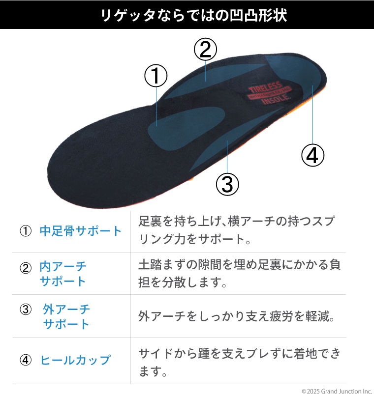 リゲッタインソールの特徴である独自のアーチ形状とフィット感を高めるクッションが集中する負荷を分散。 丸洗いも可能なのでいつでも清潔に保つことが可能。