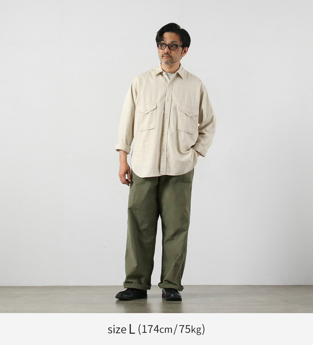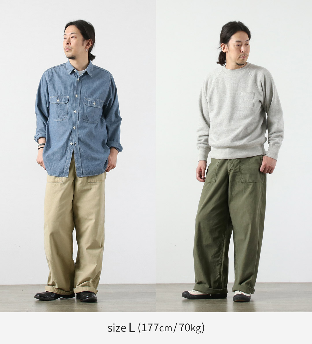 | ●スタッフ 身長・体重:181cm / 78kg 着用サイズ:XL 体型タイプ:がっしり 太ももまわり:しっかりめ フィット感:ジャスト 丈感:ちょうど ウエストはジャスト、わたり36cmの恩恵でがっしりした脚回りも完全にカバーしてくれます。高身長でも裾幅が迫力あるのワイドラインを存分に楽しめる一着です。 |