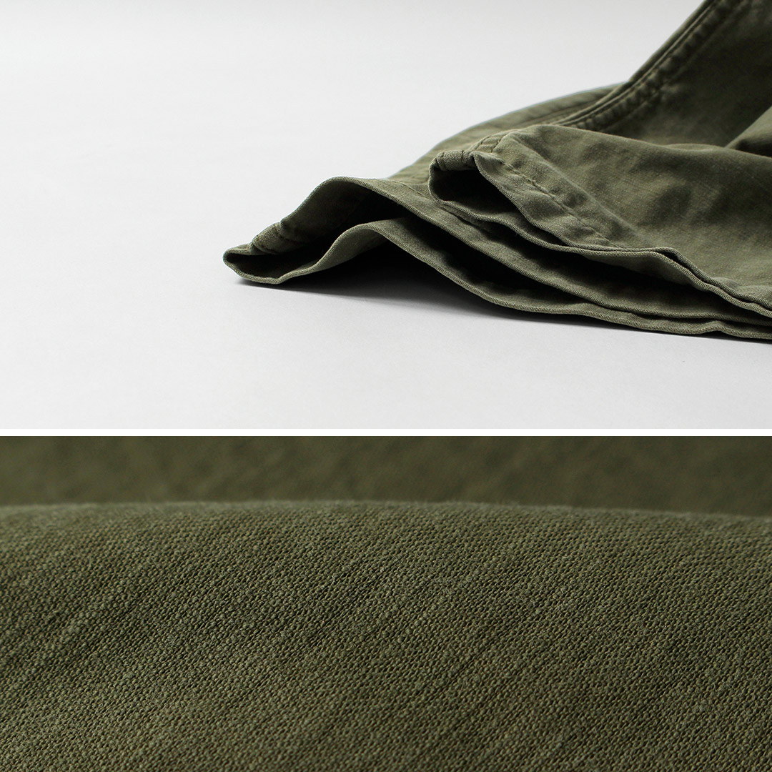 1950年代半ばに米軍の主戦闘服に使用されていた「バックサテン」生地を採用し、コットン素材に硫化染加工を施すことで、ヴィンテージ感あふれる仕上がりに。リアルな色褪せや、独特の風合いが時間と共に味わい深くなっていきます。