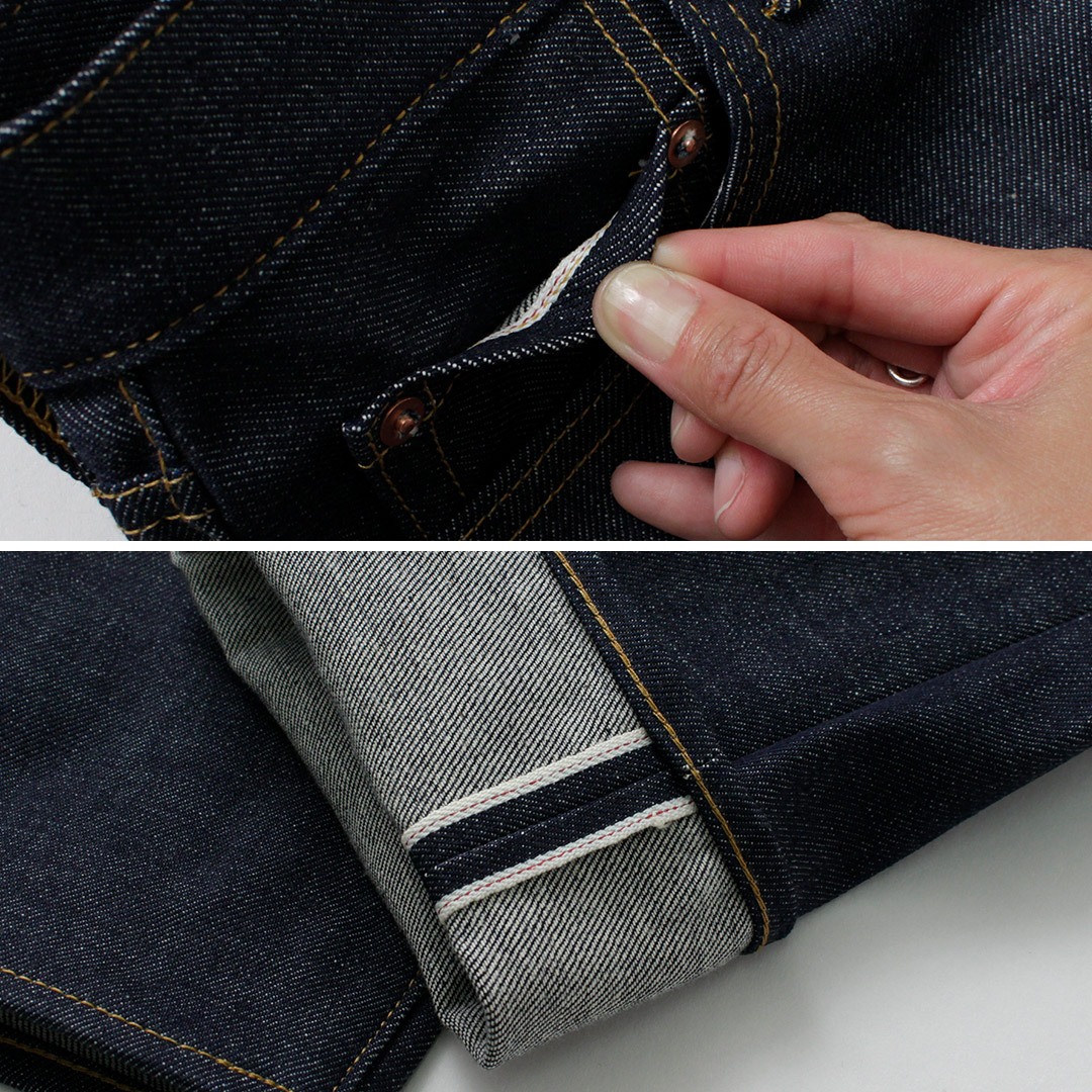 コインポケット、裾は折り返すと、ほつれ止めの赤いステッチである通称「赤耳」が顔を覗かせます。