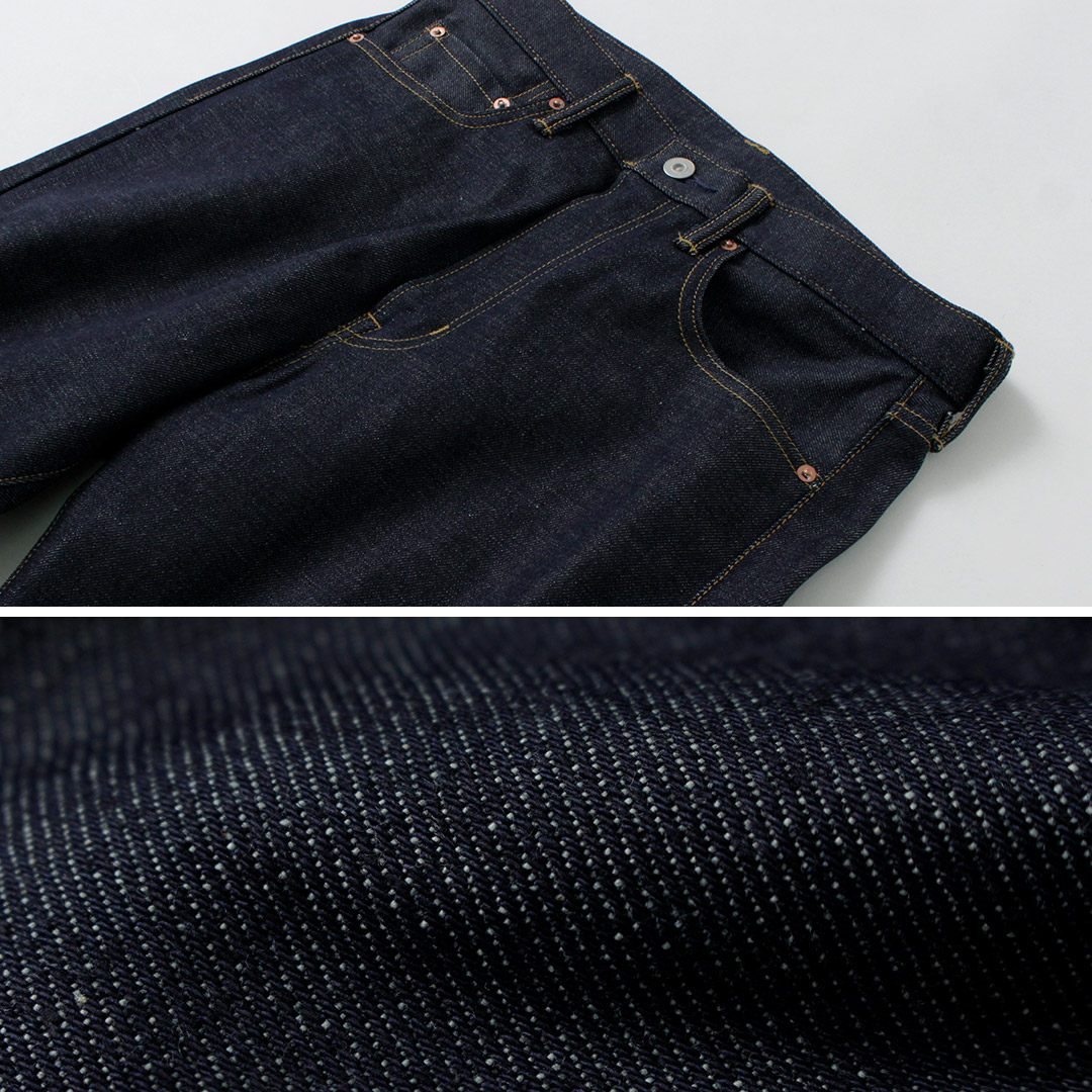 日本製の14.75オンスセルビッチデニムを採用。ヴィンテージ(旧式)のシャトル織機で織り上げられた生地は、柔らかな風合いと耐久性を兼ね備えています。