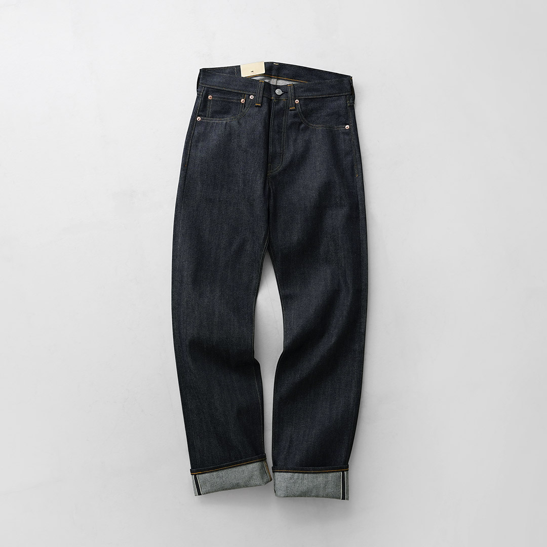 戦後すぐの1947年モデルは、1944年モデル(大戦モデル)よりも少し細身のストレートシルエットです。股上がやや浅く、膝下から裾までまっすぐ落ちる美しいラインが特徴。すっきりしたシルエットが現代のスタイリングにも取り入れやすい一本です。