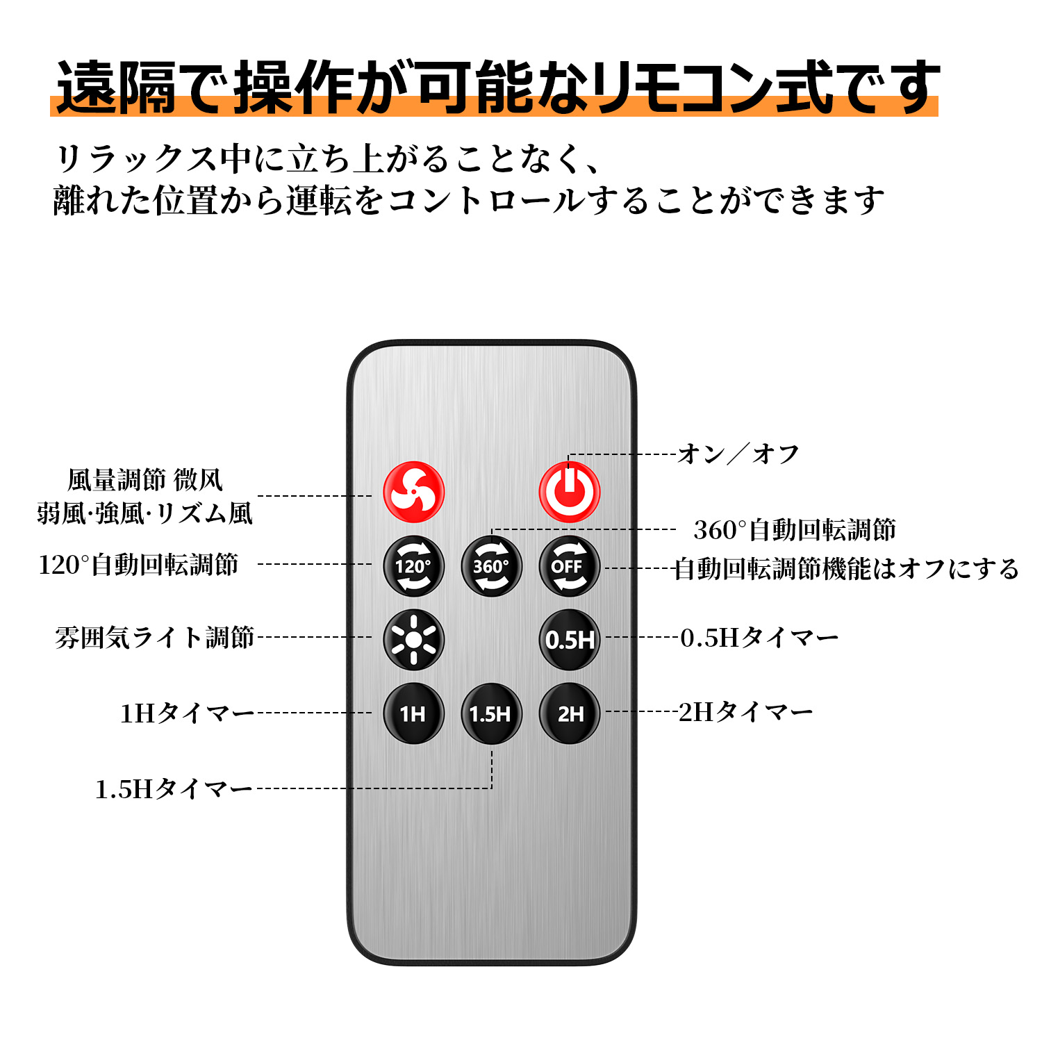 風力は弱風、中風、強風、自然風の4段階で切り替え可能です。風量はリモコンで調節でき、風量はファン背面のボタンで調節できます。