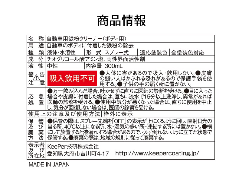 KeePer技研 キーパー コーティング専門店の鉄粉クリーナー ボディ用 300ml 中性 コーティング車対応 洗車用品 ST15007 (沖縄・離島 配送不可)