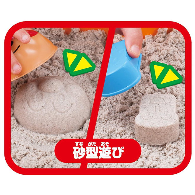 ●お子様の大好きなアンパンマン・ばいきんまん・ドキンちゃんの半立体の砂型が付いています。カレーパンマン・しょくぱんまん・あかちゃんまん・コキンちゃん・メロンパンナちゃん・クリームパンダのシルエットに顔が表現される砂型もついています。