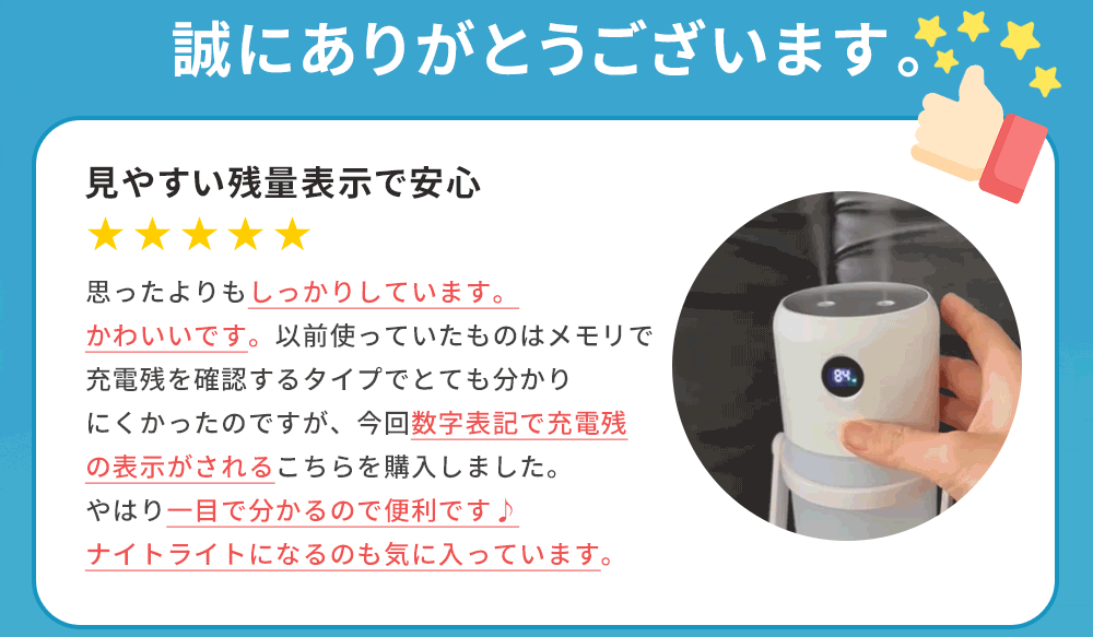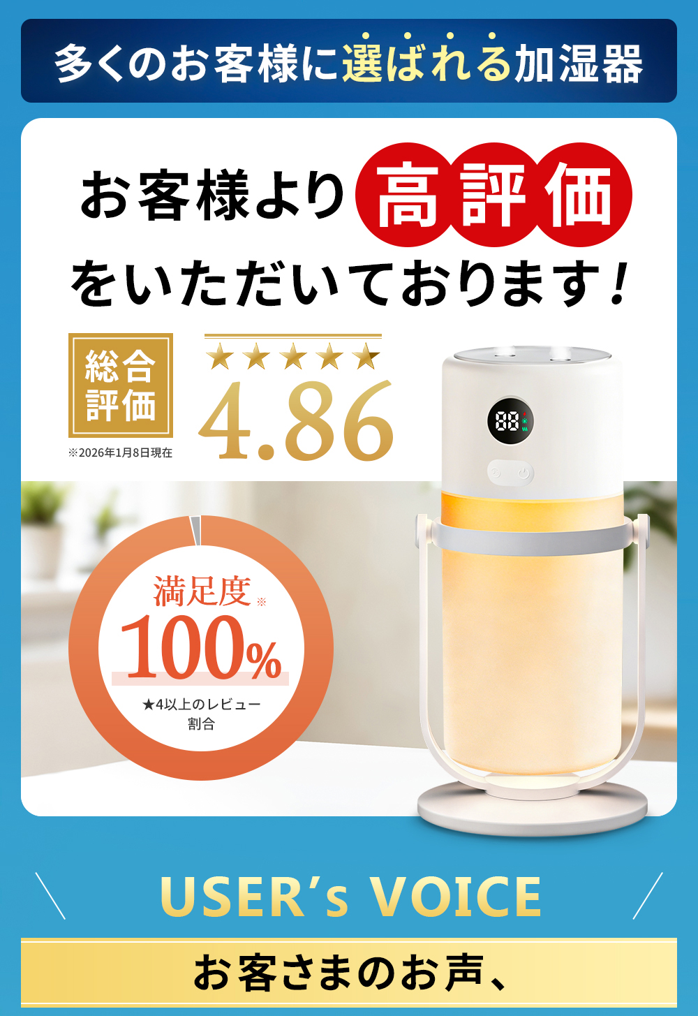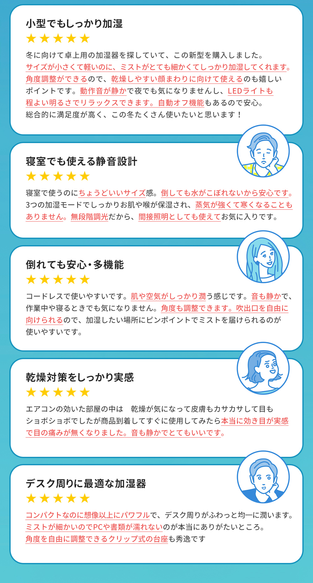 寝室・オフィス・車内・リビングでどこでも快適に使えるパワフル加湿。