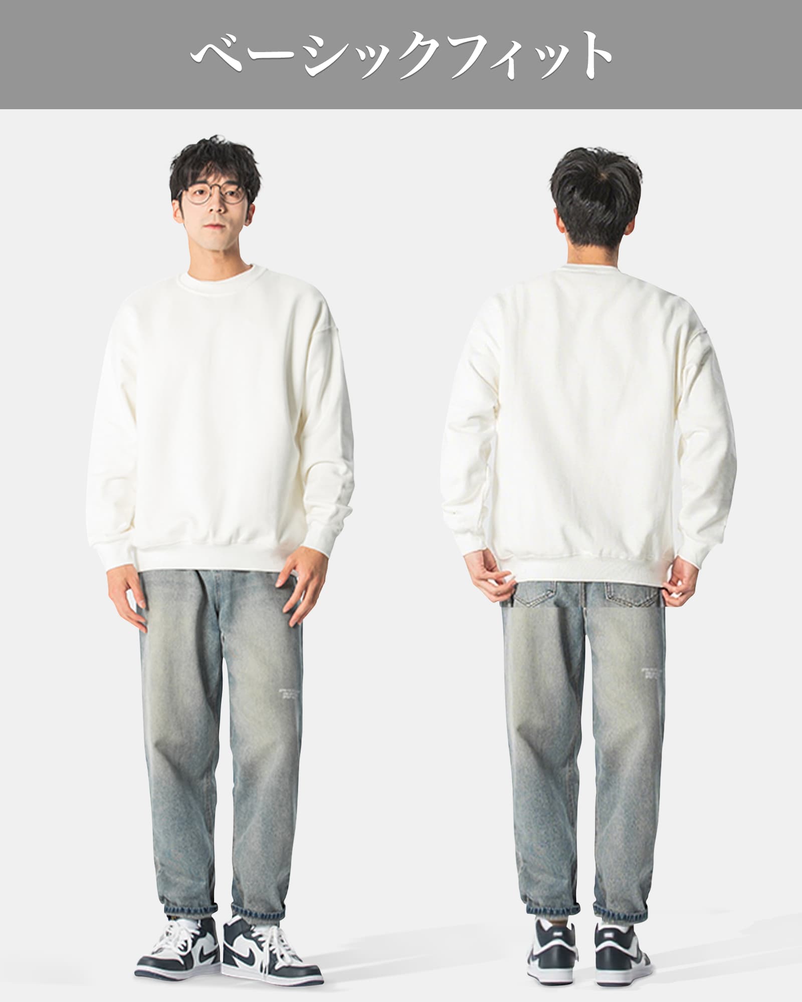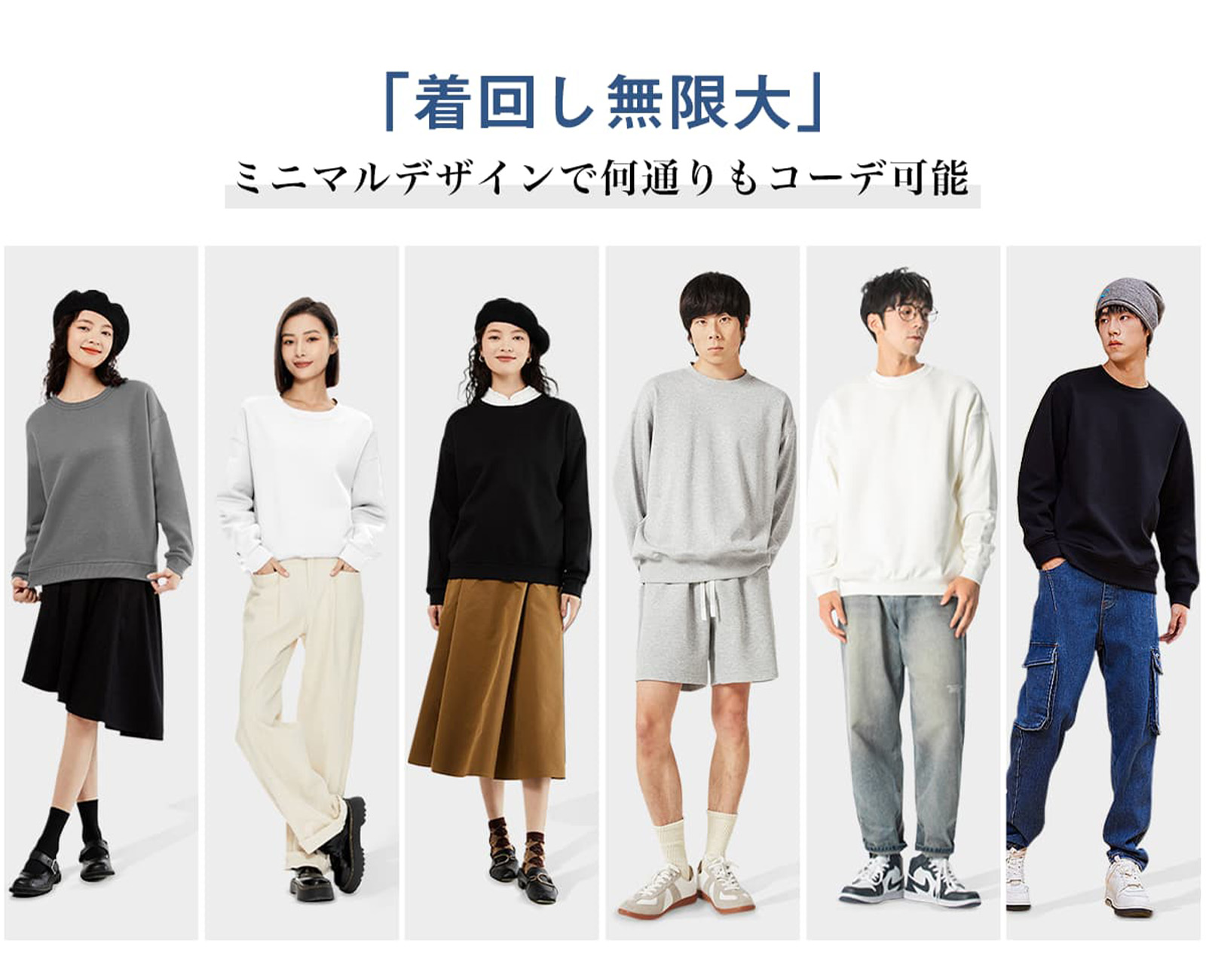 [着回し力トレーナー] 全てのボトムスと相性抜群(ジーンズ・スカート・カーゴパンツ等)。アウターとの重ね着もスムーズ(MA-1ジャケット/ダウン対応)。