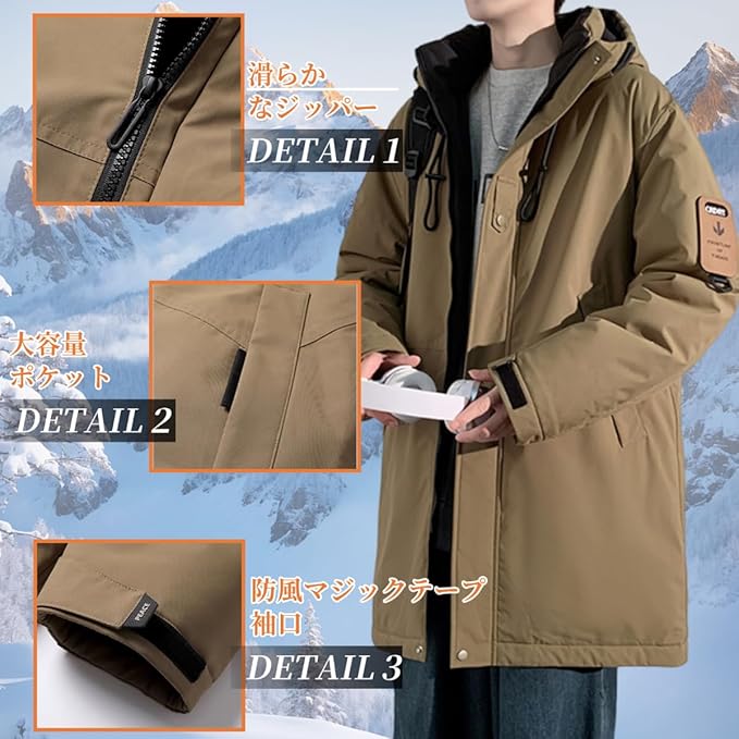 【実用デザイン】1.防風スタンドカラーデザイン。前身頃のジッパーを最上部まで上げるとスタンドカラーが形成され、伸縮可能なフードデザインと組み合わせることで、首や頭部が冷風に直接さらされるのを防ぎ、温度変化に敏感な部位の保温性を効果的に維持します。2.マジックテープ袖口:袖口のマジックテープを締めると袖口が収縮し、袖口からの冷気の侵入を減少させ、体内の暖かさを効果的に維持します。3.両サイドの深いポケット:紛失しやすい小物類を確実に収納できるだけでなく、手を温めることも可能です。さらに大容量の内ポケットが追加され、携帯電話、財布、鍵などの日常品を効果的に収納し、紛失を防ぎます。