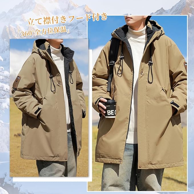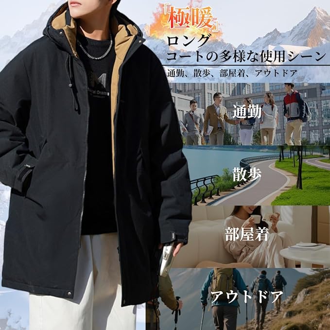 【高品質生地】ロングコートは高密度で保温性に優れた綿素材を充填し、優れた蓄熱特性により外部からの冷気を効果的に遮断し、卓越した保温効果を実現します。表地には精密に編まれたポリエステル繊維を採用し、防水性と防風性を兼ね備えています。吹雪や雨天時でもお手入れが簡単で、外気の冷風を効果的に遮断し、常に身体の内部を温かく保ちます。裏地にはふんわりとした快適で通気性に優れたポリエステル素材を採用。