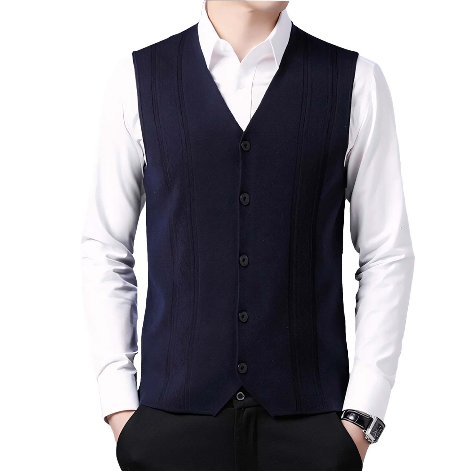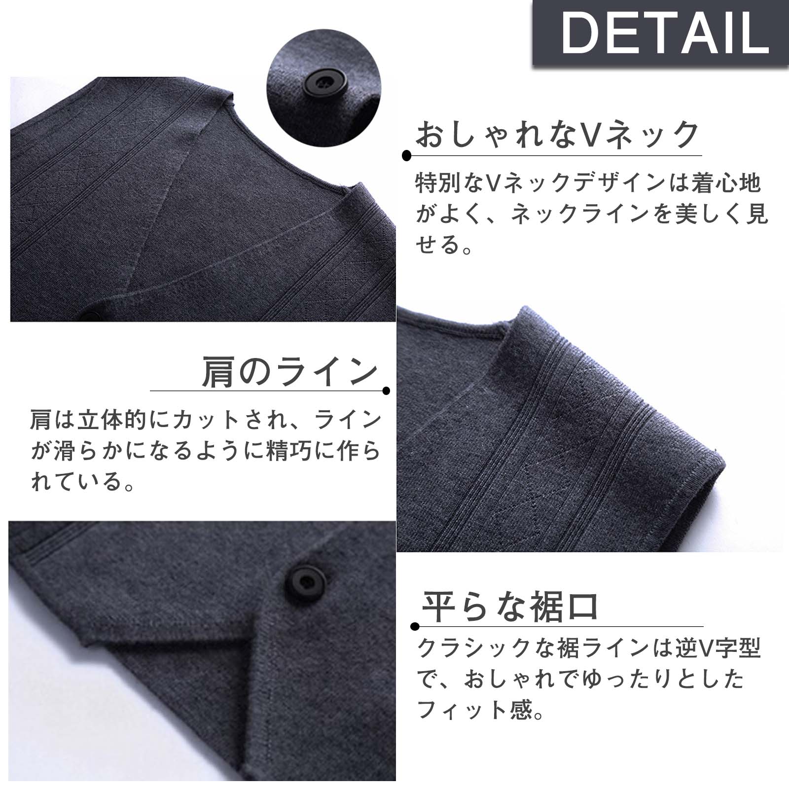 定番のVネック前開きニットベストで、ポリエステル生地を採用しているため、肌触りが柔らかく暖かく、伸縮性抜群で快適な着心地です。カーディガンベストは薄手に見えますが保温性を持ち、ちょうど良い厚みで着膨れせず、スーツのインナーとしてもスッキリと着こなせ、スーツで通勤や お仕事をされる方にぴったりで、春、秋、冬と長時間の着用にとても活躍する実用的なニットベストです。