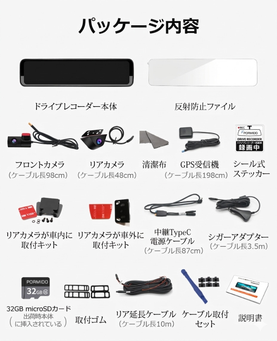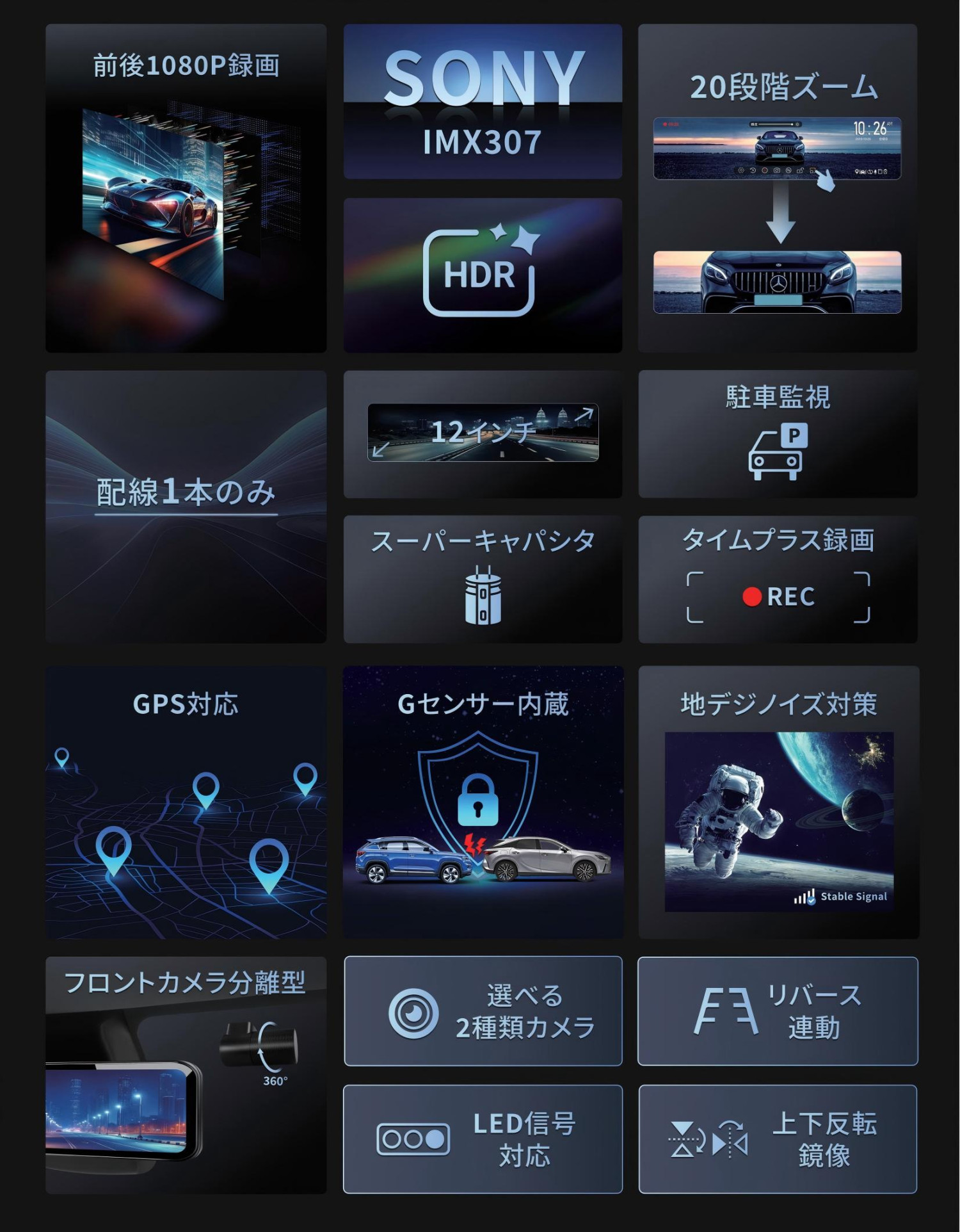 ドライブレコーダー ミラー型 前後 2カメラ 12インチ 20段階ズーム機能 分離型 SONY STARVIS IMX307センサー HDR/WDR ドラレコ フルHD 1080P 駐車監視 GPS PR998