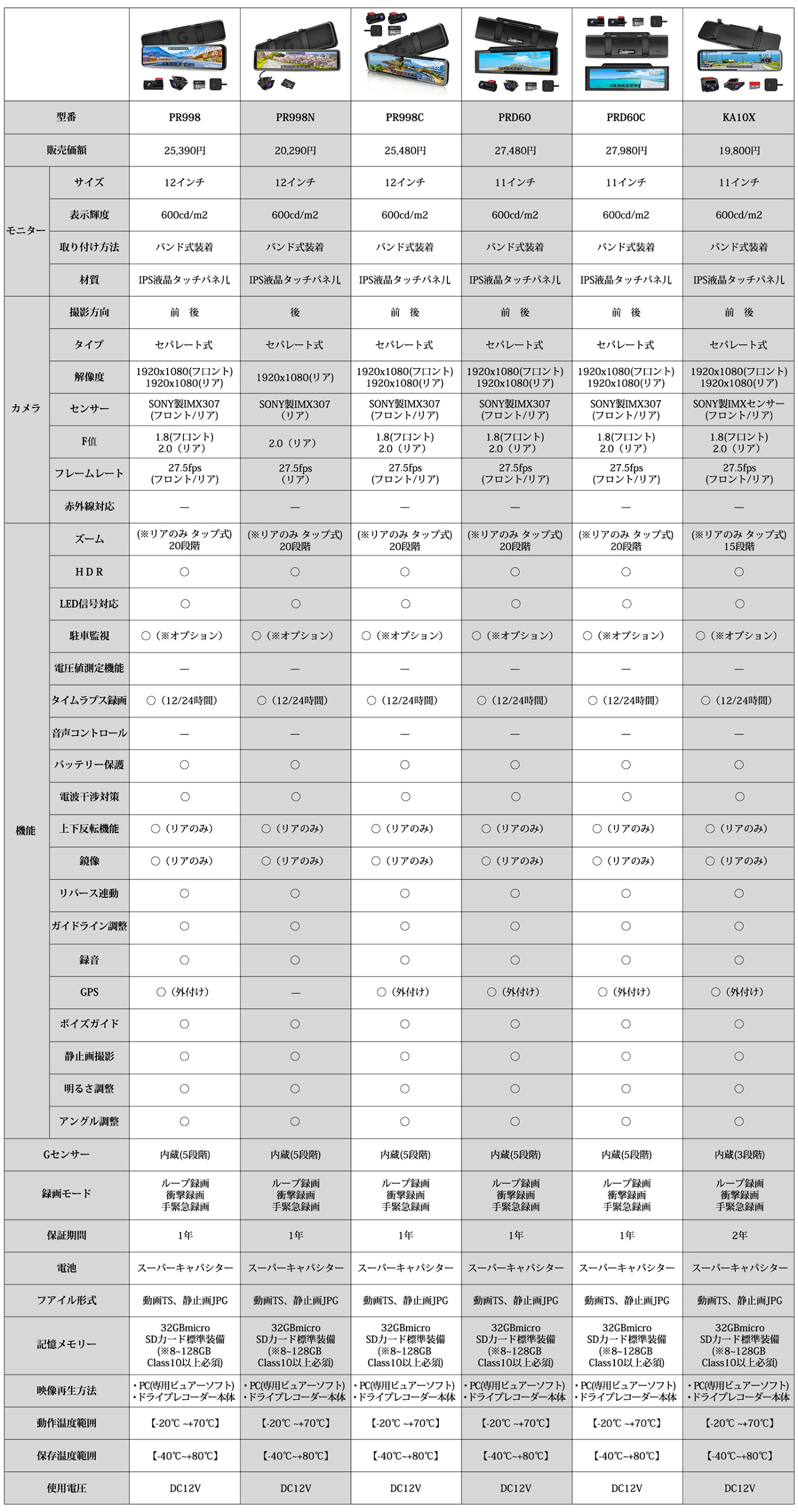 ドライブレコーダーミラー型 12インチ リアカメラのみの後方フォロー特化設計 SONY IMX307センサー ズーム機能 上下/左右反転可能 フルHD 1080P 超強暗視 pr998n