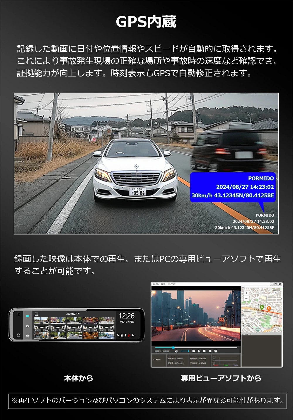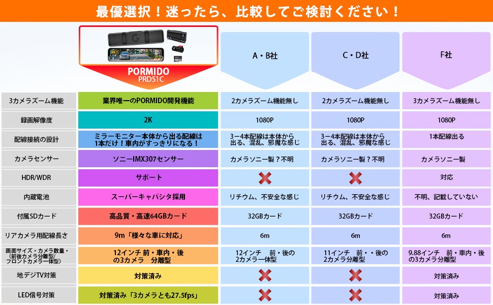 ドライブレコーダー ミラー型 前後 2カメラ 分離型 SONY IMX307 12インチ 20段階ズーム機能 車内専用リアカメラ HDR/WDR FHD 1080P IPSタッチパネル GPS PR998C