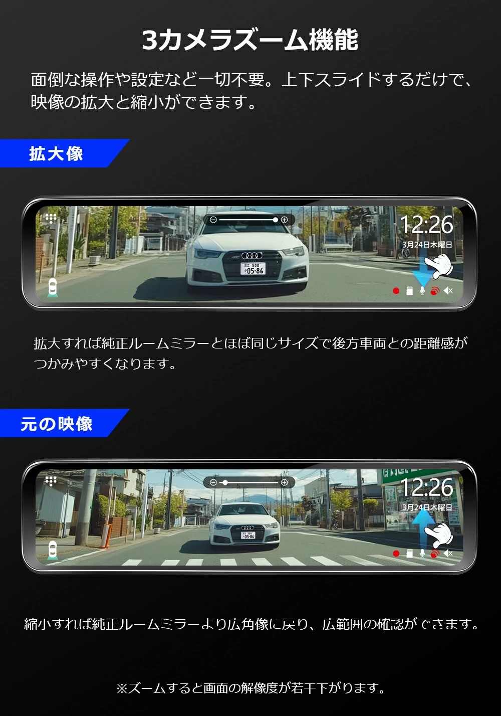 ●前・車内・後 3カメラズーム機能