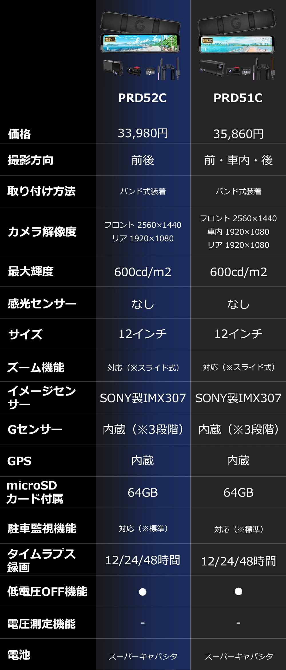 ドライブレコーダー ミラー型 前後 360度 12インチ 2K 1440P ドラレコ SONY STARVIS 3カメラ 分離型 ズーム機能 GPS Gセンサー HDR/WDR 駐車監視 後付け PRD51C