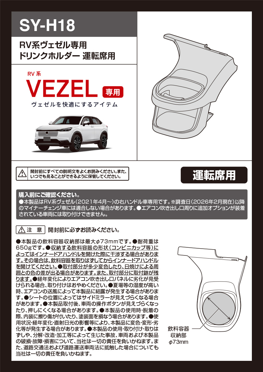RV系 ヴェゼル 専用 ドリンクホルダー 運転席用 SY-H18 YAC 爆買