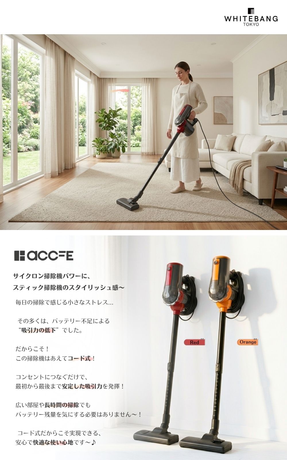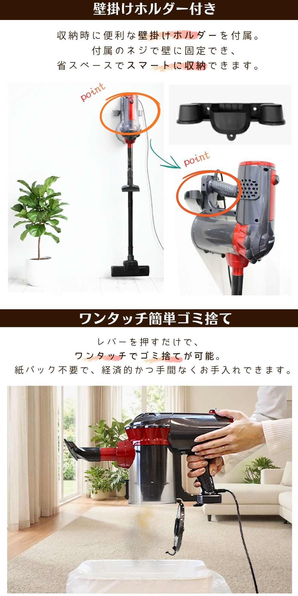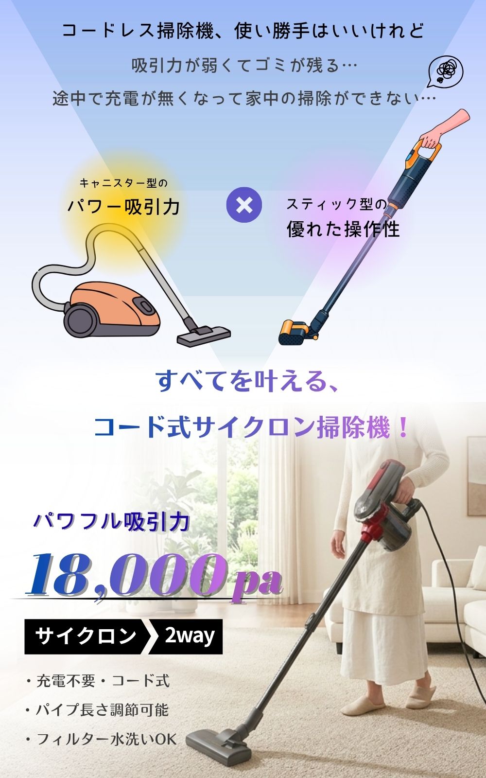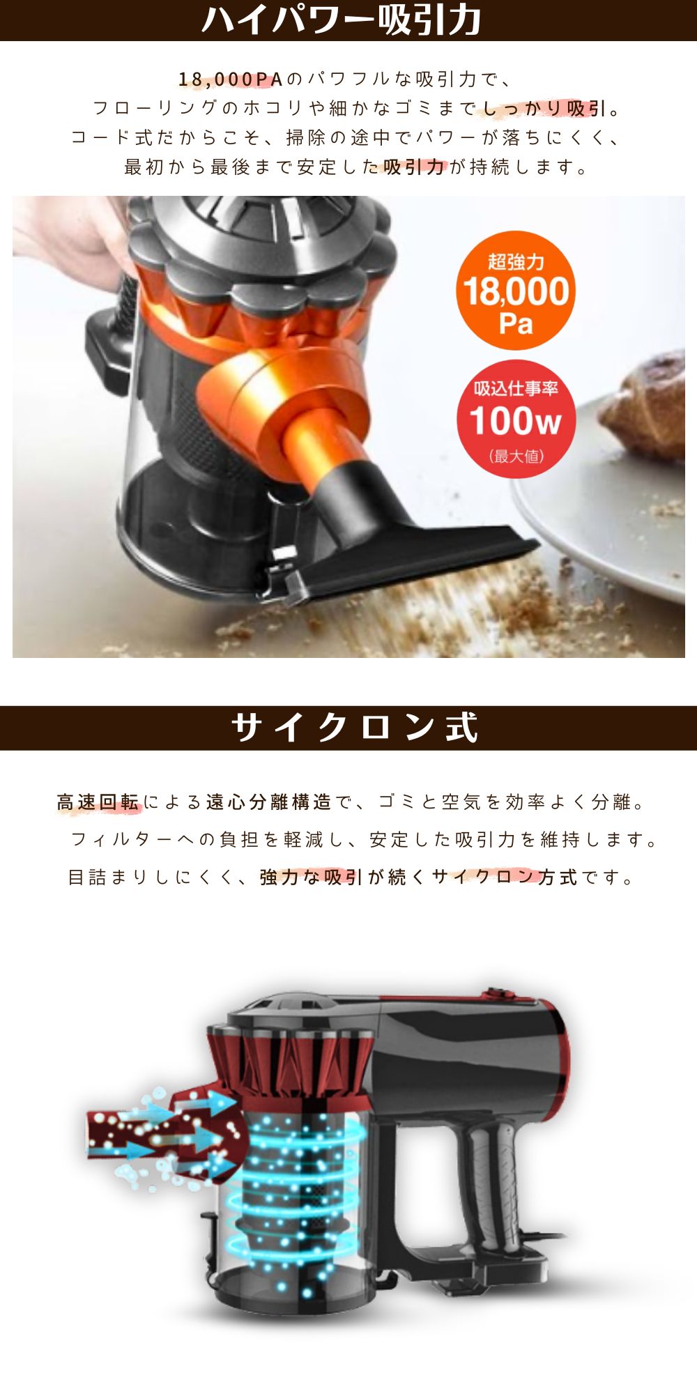 独自のサイクロン式設計と、コード式なので吸引力が持続します。