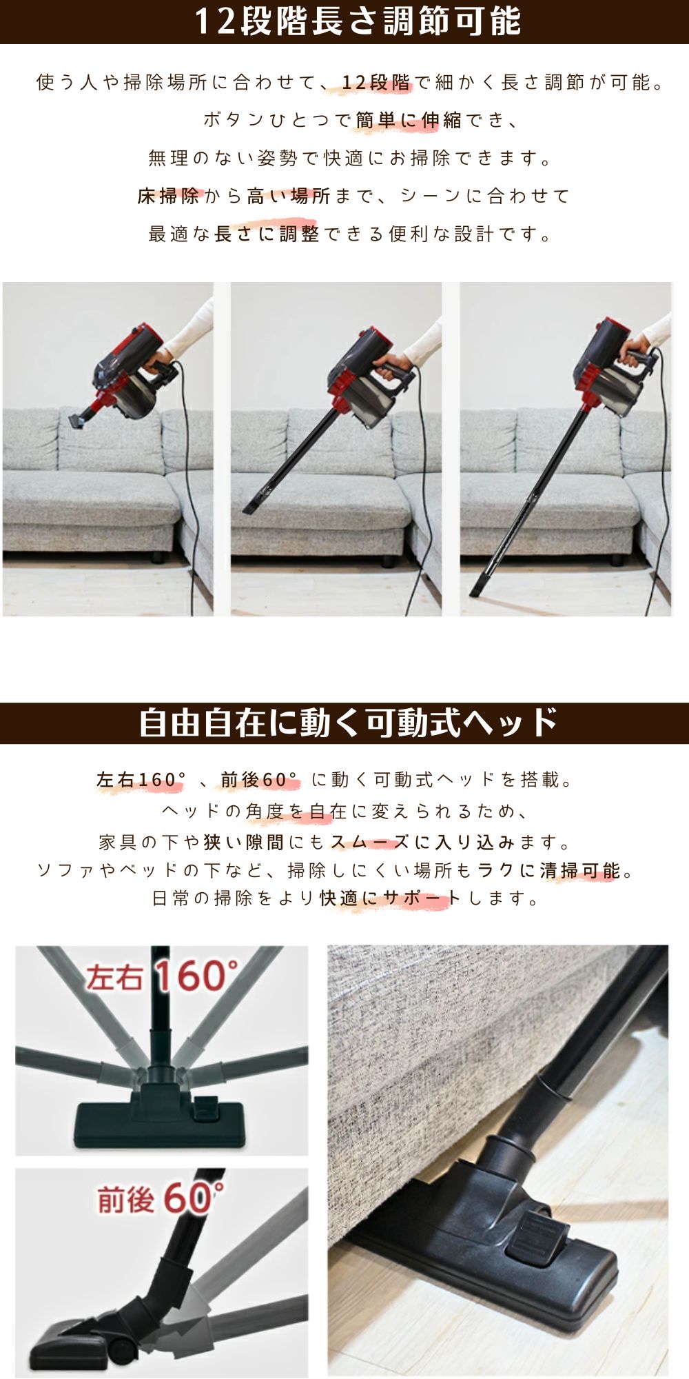 ヘッド部分は自在に角度を変えられるので、家具の下もスムーズに掃除ができます。