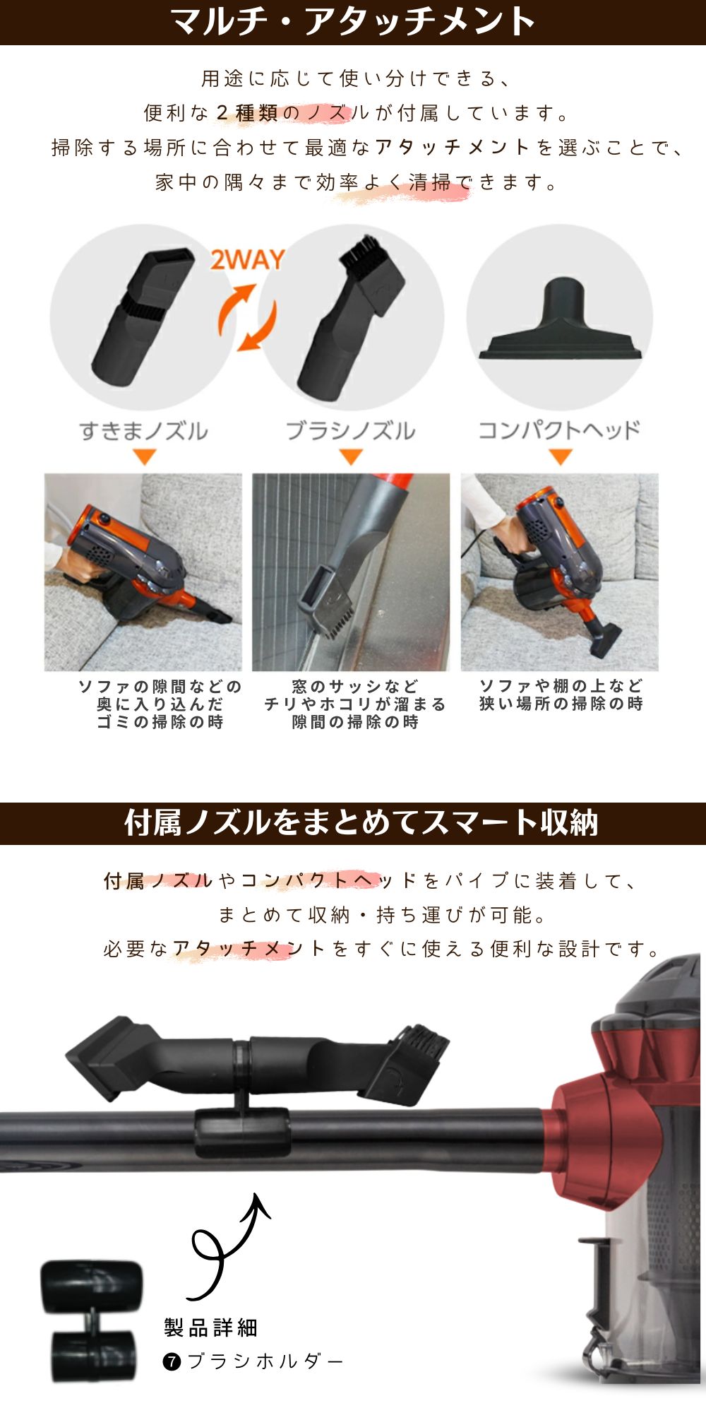 すきまノズル&ブラシノズル(2Way仕様)、コンパクトヘッドが付属しているので、1台で隅々までお掃除できます。