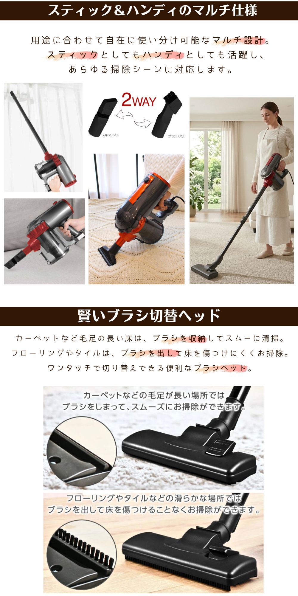 絨毯などの毛足が長い場所と、フローリングなどの硬い床でブラシヘッドの使い分けが可能です。