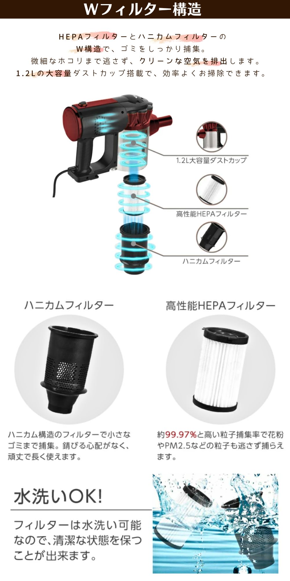 高性能HEPAフィルター:約99.97%と高い粒子捕集率で、花粉やPM2.5などの粒子も逃さず捕らえます。