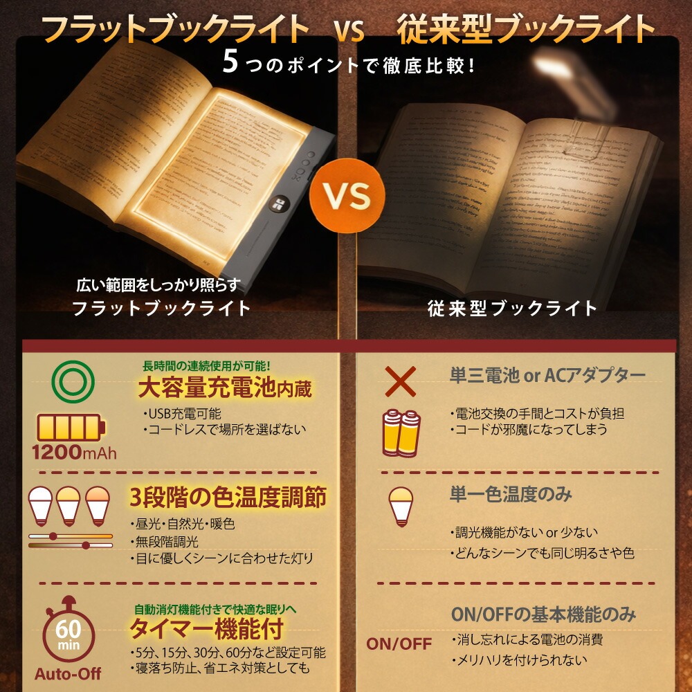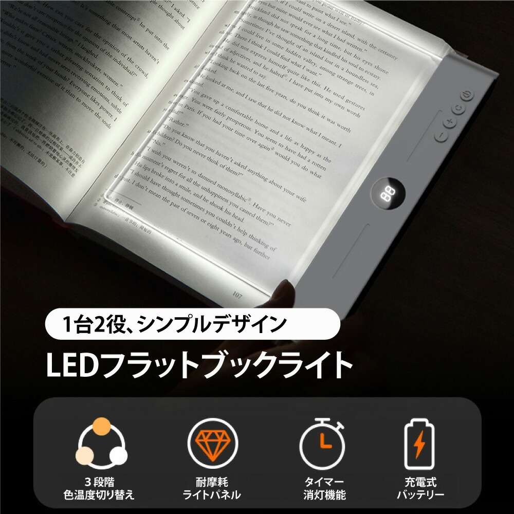 ブックライト 読書灯 LED 充電式 フラット 3色調光 無段階調光 タイマー付き 目に優しい ベッドサイド 平板型読書灯 3種の色温度 ポータブル 明るさ調整