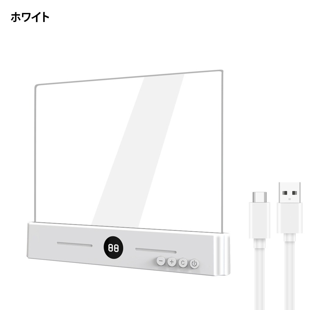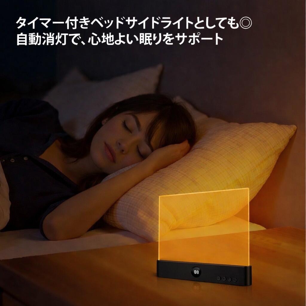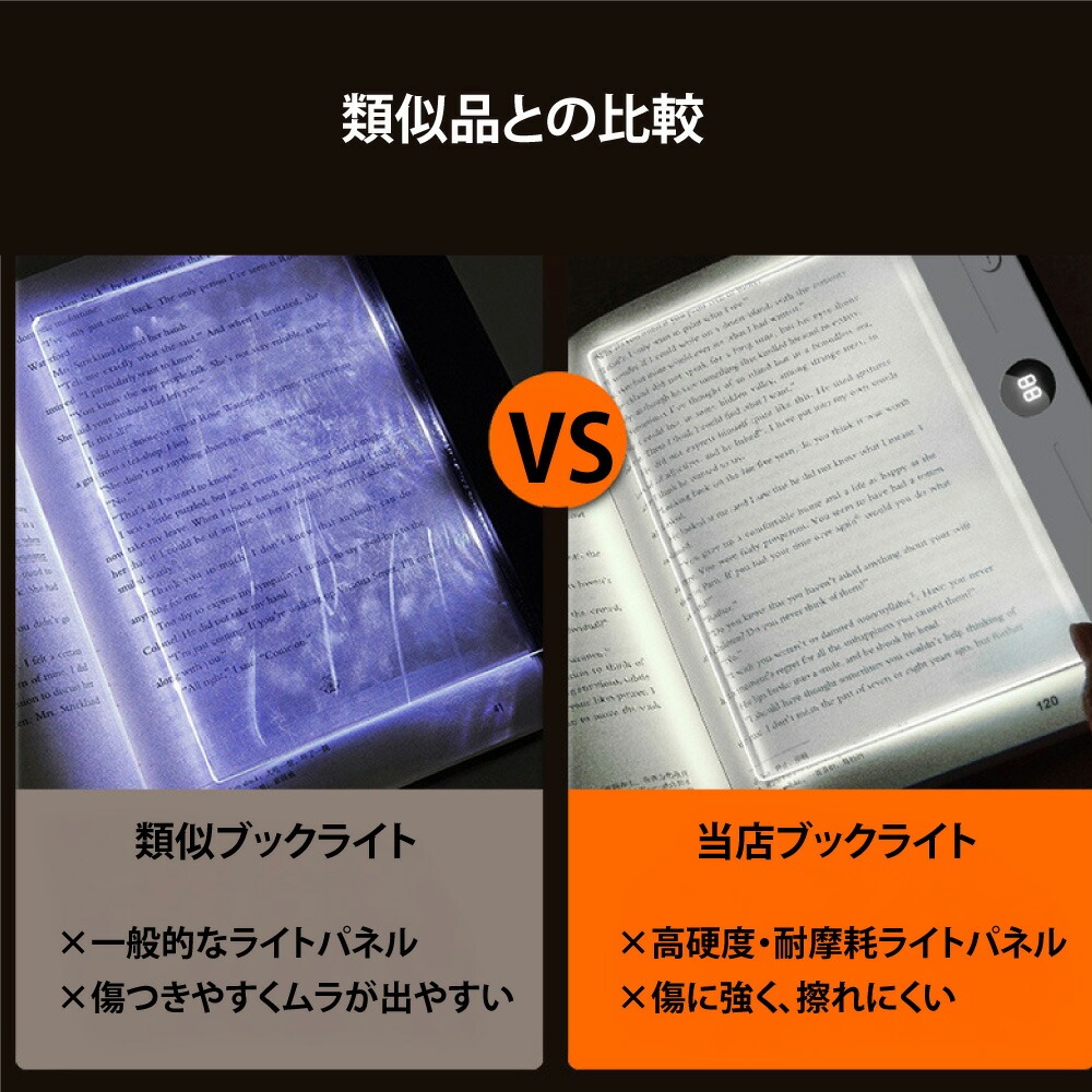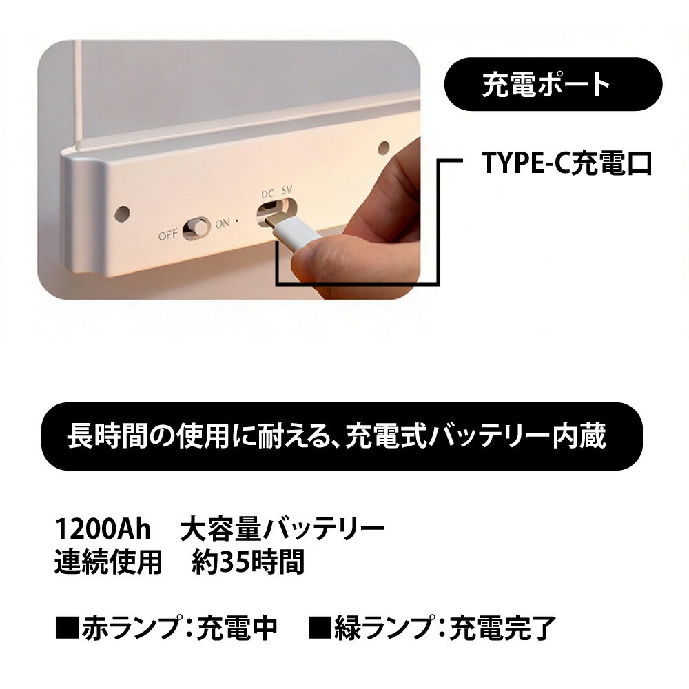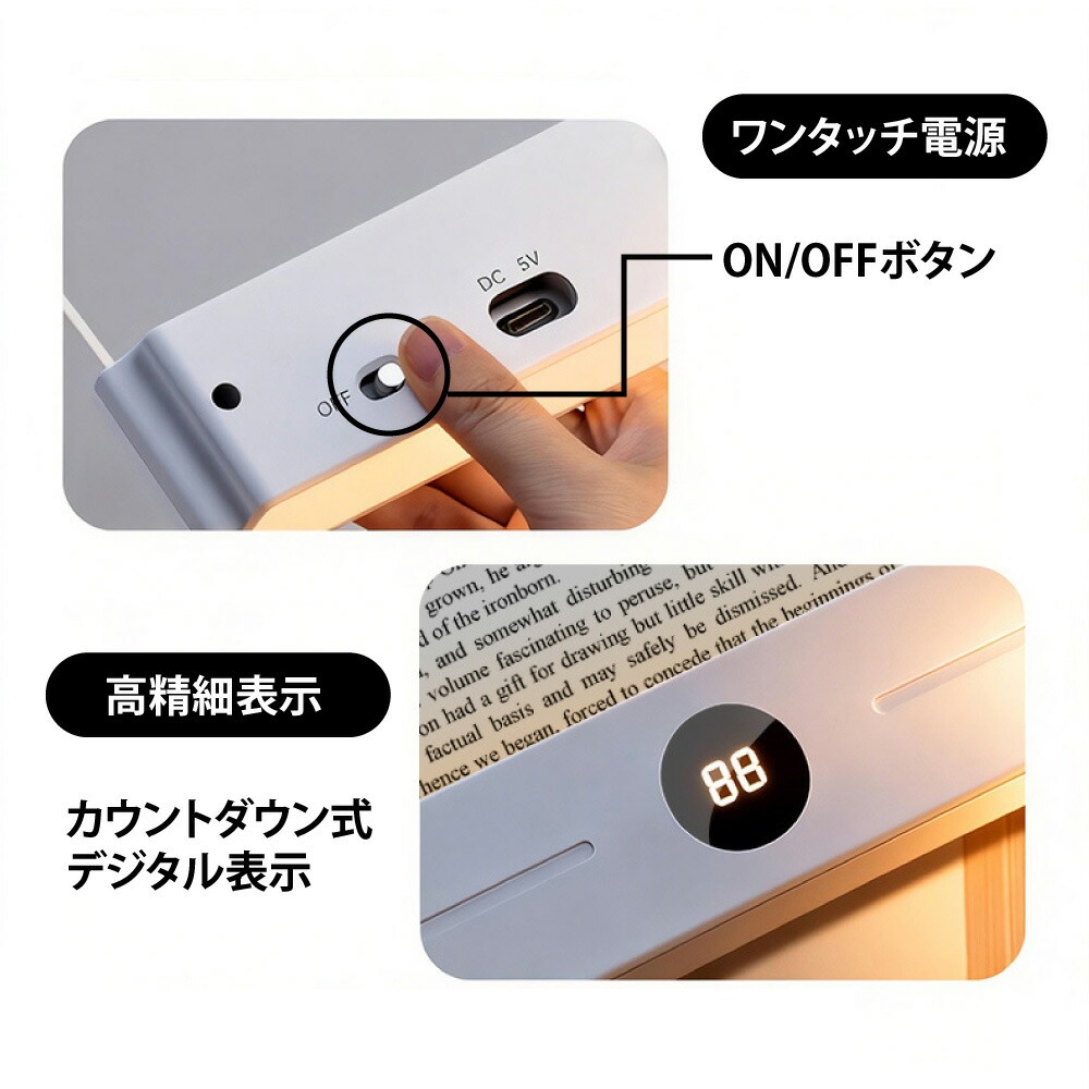 | 充電式&2WAYフラットプックライト ベッドサイド&ブックライトに簡単切り替え 調光/調色/タイマ一消灯/大容量バッテリ一 1台2役シンプルデザイン 3段階色温度切り替え/耐摩耗ライトパネル/タイマ一消灯機能/充電式バッテリ一 ワンタッチ電源:ON/OFFボタン 高精細表示:カウントダウン式デジタル表示 充電ポ一卜:TYPE-C充電口 長時間の使用に耐える、充電式バッテリ一内蔵 1200Ah大容量バッテリ一 連続使用約35時間 ■赤ランプ:充電中■緑ランプ:充電完了 3色の色温度×無段階調光で さまざまな空間の二一ズに対応:自色光・暖色光・自然光 無段階調光(電源長押し) カウントダウン表示・タイマ一消灯 0〜99分まで設定可能 時間がひと目で分かります カラ一バリエ一ションは2種類:ホワイト・ブラック タイマ一付きべッドサイドライトとしてもの 自動消灯で、心地よい眠りをサポ一ト 類似品との比較 類似ブックライト: 般的なライトパネル傷つきやすくムラが出やすい 当店ブック 高硬度?耐摩耗ライトパネル→傷に強く、擦れにくい |
