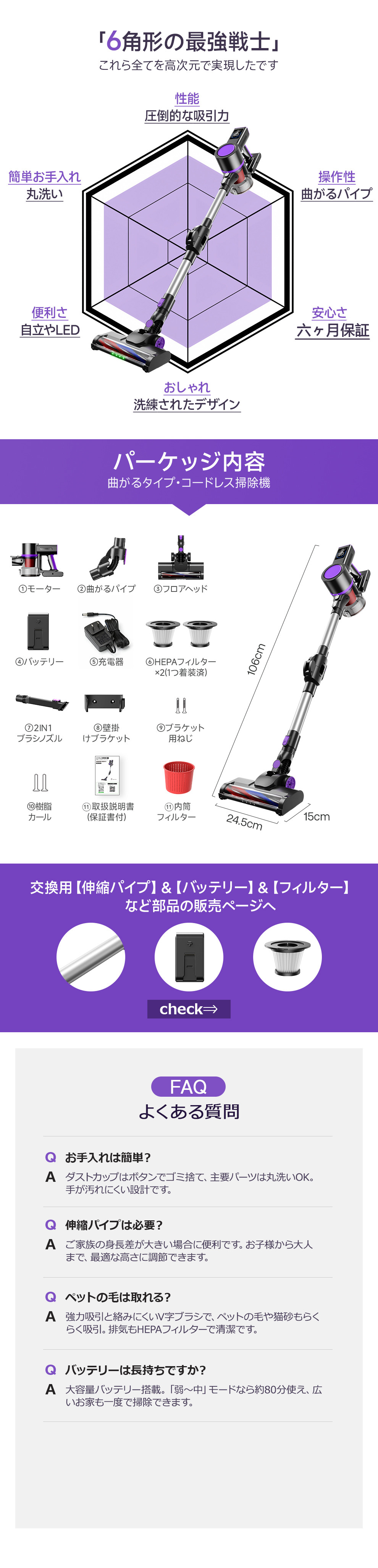 「クーポンで12,980円」掃除機 コードレス 75kPa吸引力 自立式 自走式 曲がるパイプ 伸縮パイプ サイクロン式 強力吸引 6IN1 HEPAフィルター ヘッドライト
